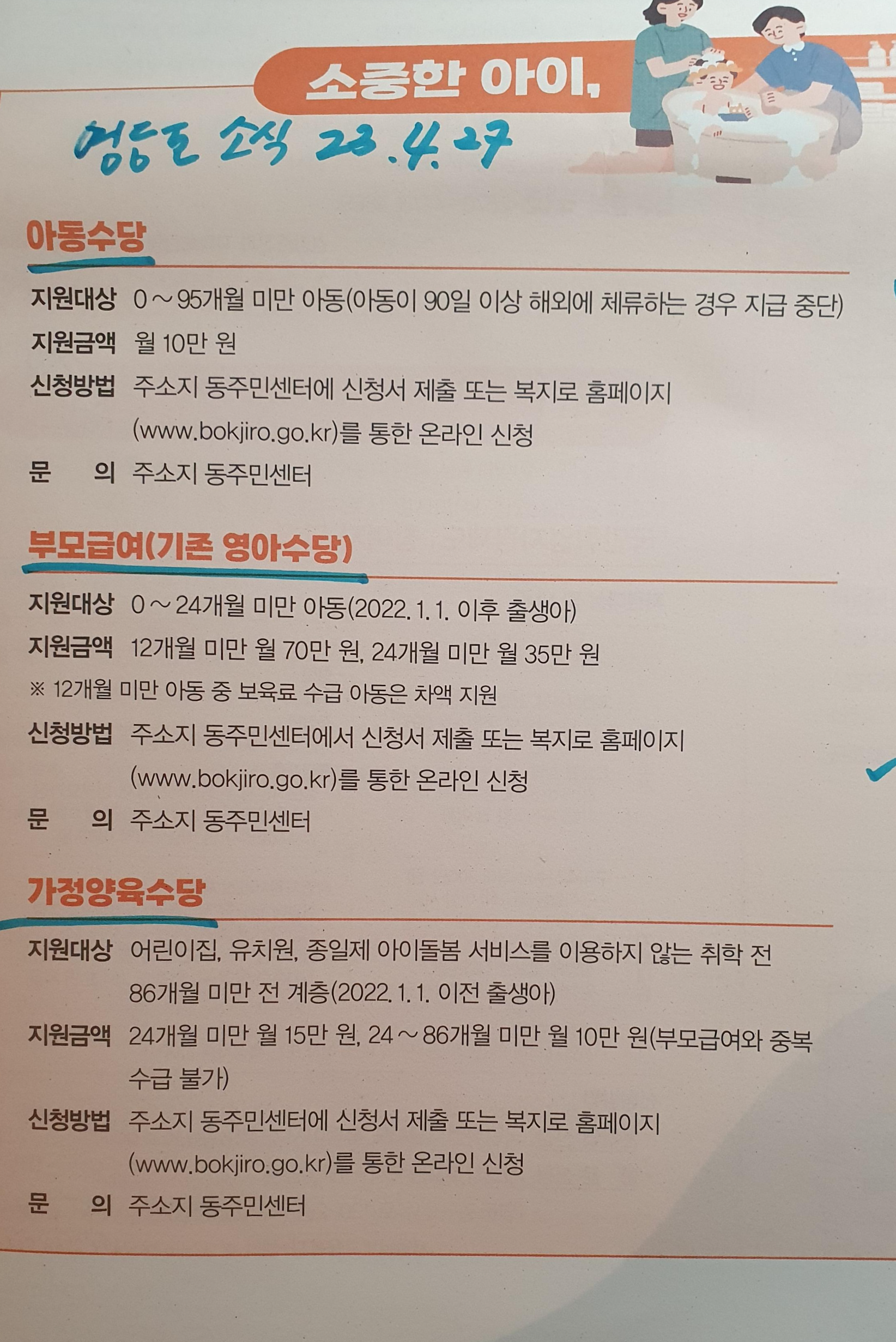 신청 방법은 복지로 홈페이지를 통한 신청도 있지만 개인적으로는 아동수당과 부모급여를 한번에 처리 가능한 주소지의 동주민센터에서 신청하는 방법을 추천.