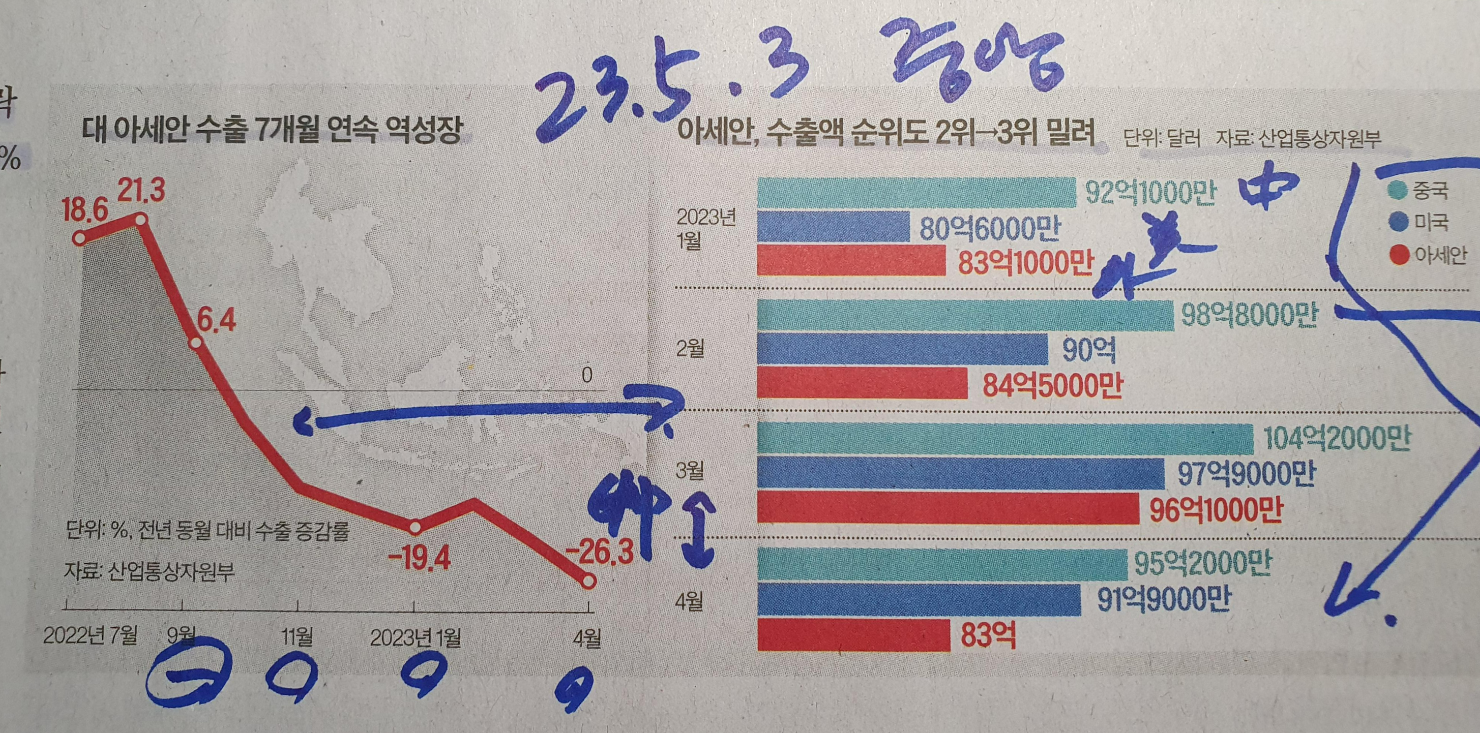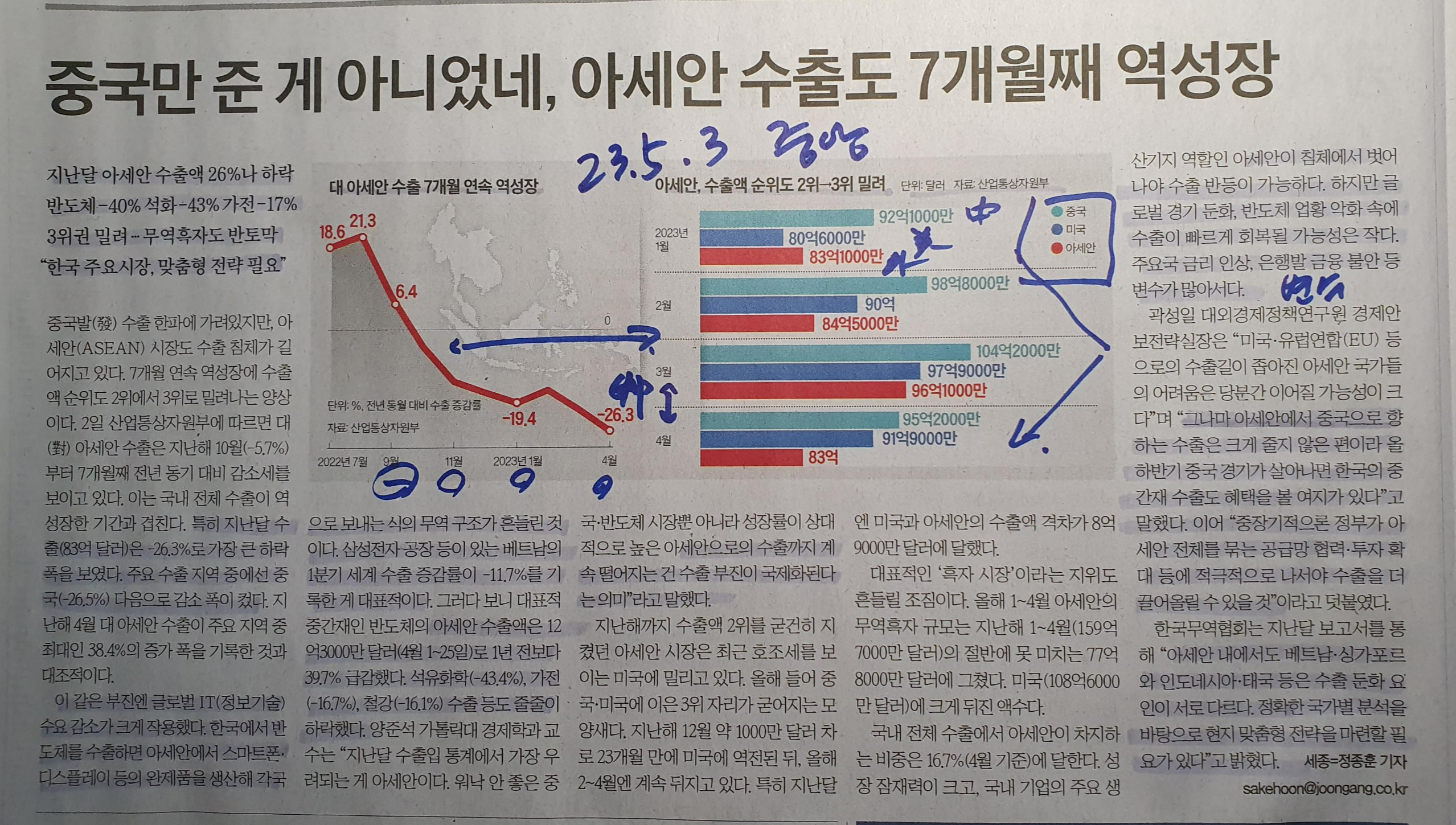 대한민국 아세안 수출 연속 역성장, 수출액 순위도 하락 23.5.3 중앙