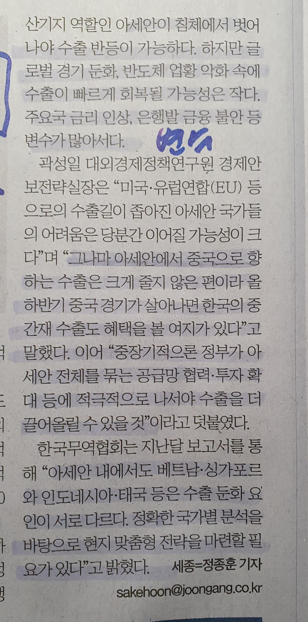 -그나마 아세안에서 중국으로 수출은 크게 줄어들지 않아 긍정적. 아세안 전체를 묶는 공급망 협력,투자 확대 등에 적극적으로 나서야 수출을 더 끌어 올릴 수 있을 것으로 전문가들은 제안.