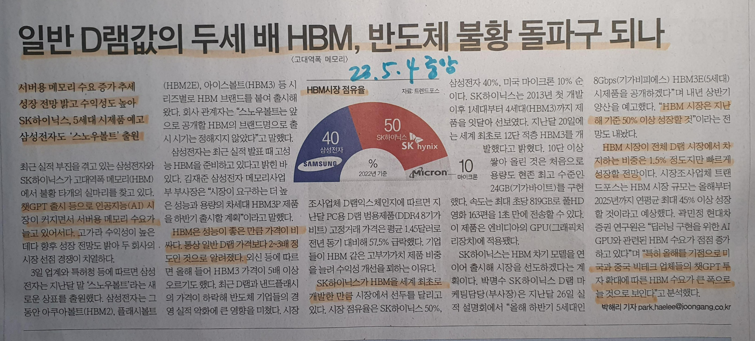 Comment)) 단순히 뉴스 기사만으로는 HBM 제품에 대한 이해가 부족하여 찾아보았다. 일반 메모리가 단독이라면 HBM메모리는 GPU와 연결성과 다단적재를 통해 성능 발전을 기존에 비하여 크게 향상 시킬 수 있는 제품이라는 것을 알게 되었다. 가격적으로 일반 메모리와는 메모리의 갯수를 비롯하여 다른 구성체가 많기에 비쌀 수 밖에 없는 제품이라 생각된다. (그래서 결국 고성능이 필요한 서버용이나 챗GPT 등의 다중 계산이 필요한 프로그램에 수요가 높아질 수 밖에 없을 듯하다)