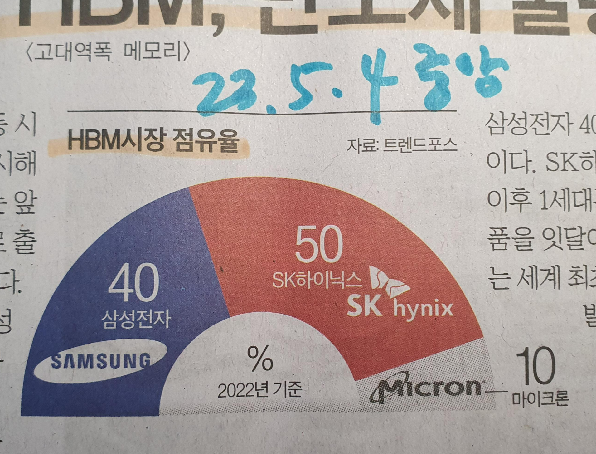 -HBM 메모리를 처음 만든 회사는 SK 하이닉스, 현재 시장도 50프로의 하이닉스와 40프로의 삼성으로 현재도 선구자적인 하이닉스가 시장을 주도하는 상황, 현재 1~4세대 HBM3 까지 제품을 보이고 있으며 지속적인 기술 개발 중.