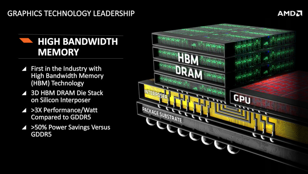 HBM은 TSV(Through-silicon via)를 기반으로 메모리 칩 위에 메모리 칩을 쌓아 올리고, 이를 GPU 옆 또는 위에 쌓을 수 있어 메모리의 속도와 집적도를 크게 높일 수 있다. 페이퍼마스터는 HBM이 GDDR5와 비교해 와트당 성능이 세 배 향상되며, 전력 효율도 50% 높아진다고 설명했다.