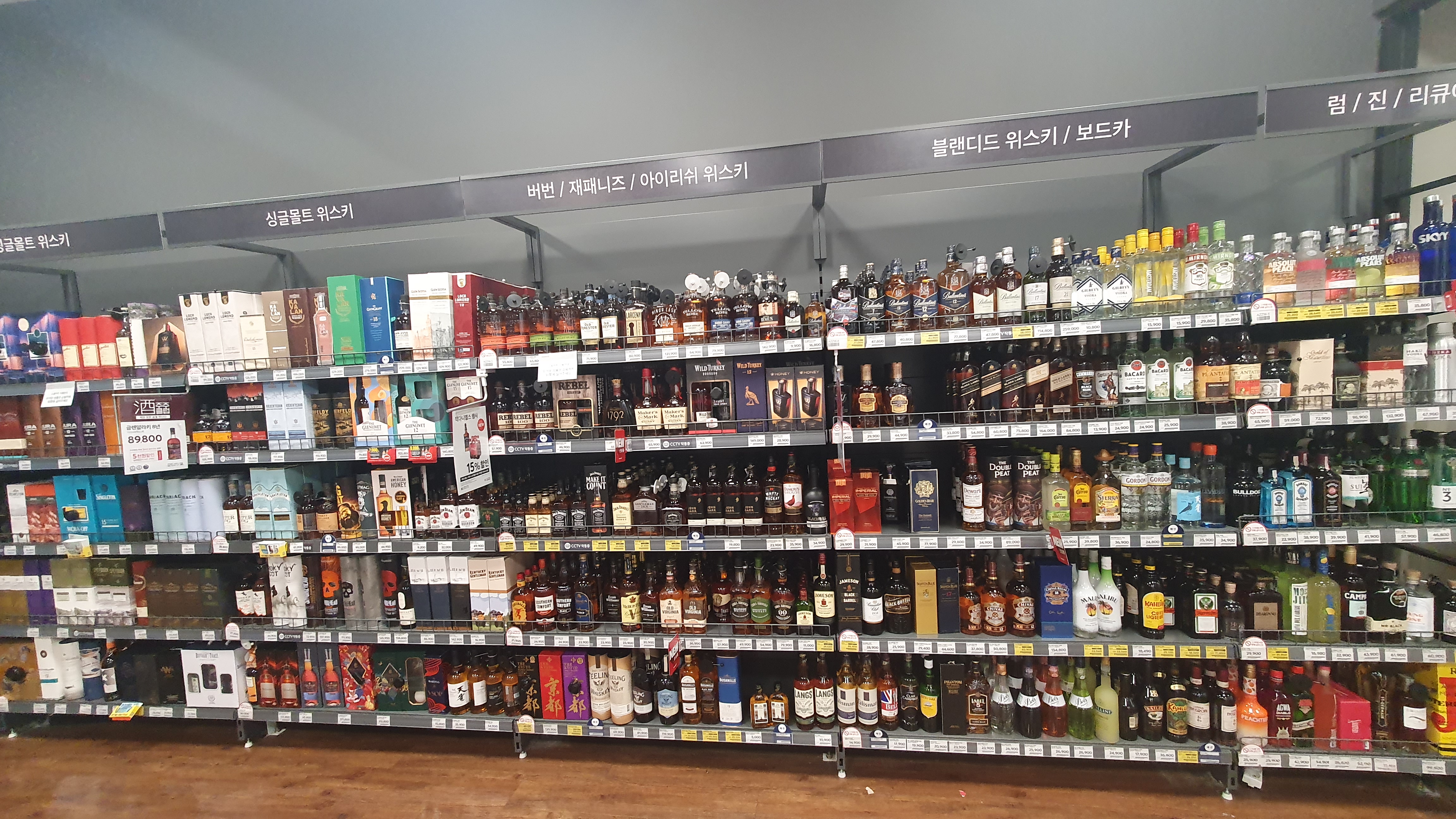 싱글몰트 위스키/ 버번 / 재페니즈 / 아이리쉬 위스키 / 블랜디드 위스키 / 보드카 / 럼 / 진 / 리큐 순으로 주류의 배치가 되어있습니다.