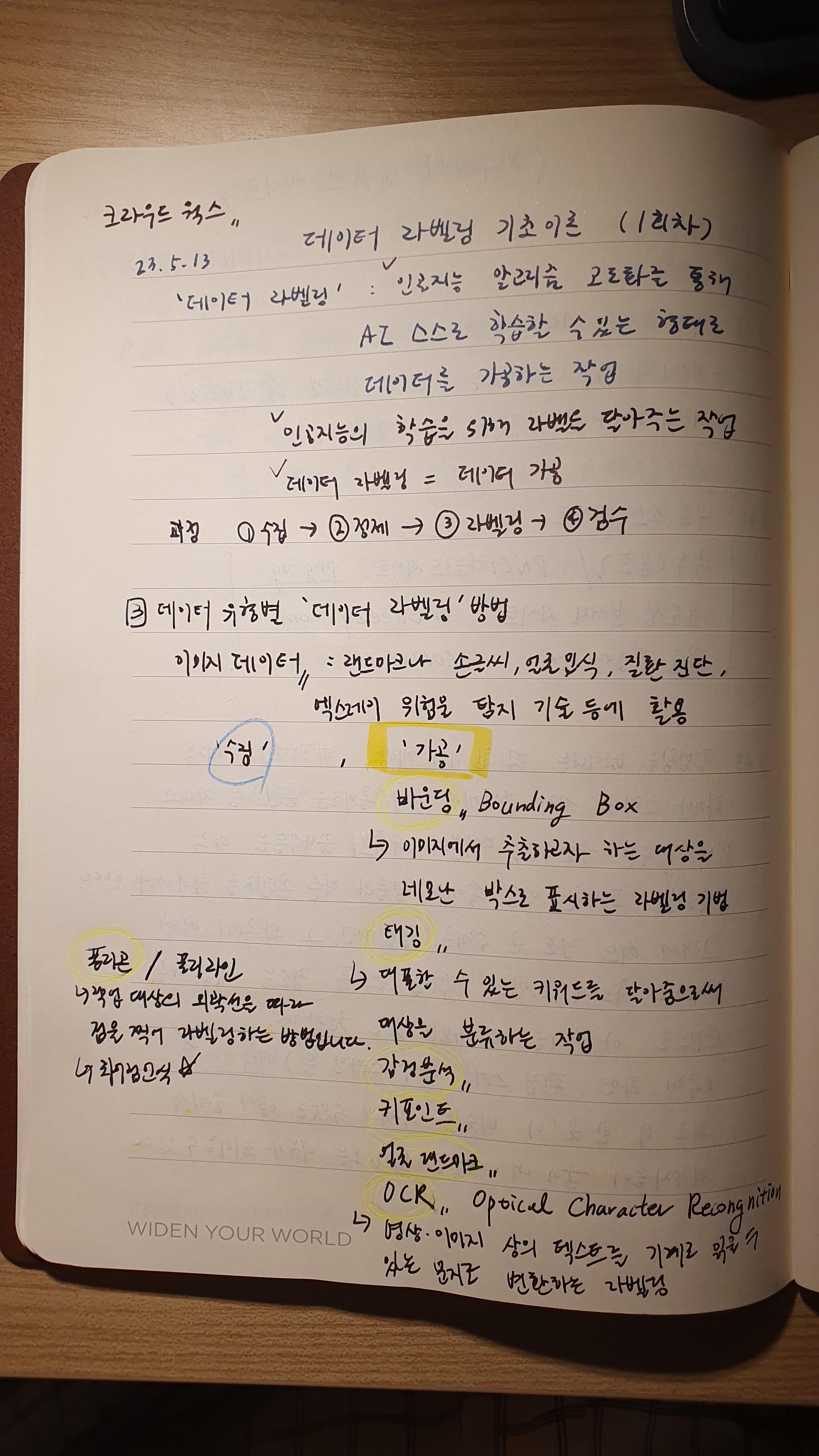 Comment)) 2년 전 코로나 직후 만들어 놓은 고용노동부의 직장인 내일 배움 카드, 정부에서 직장인들도 교육에 지원을 받을 수 있는 카드였다. 그 이후로 오프라인은 코로나로 인하여 잠정적으로 중단되었고 온라인 수업은 크게 시간 투자를 위한 동기부여가 없었는데 최근 들어 데이터 라벨링 관련 교육이 신설되어 크라우드 웍스 아카데미를 통해 데이터 라벨링 기초 이론 수업을 받게 되었다. 직장인 내일 배움 카드가 있는 분이라면 무료로 수업을 들 수 있다.