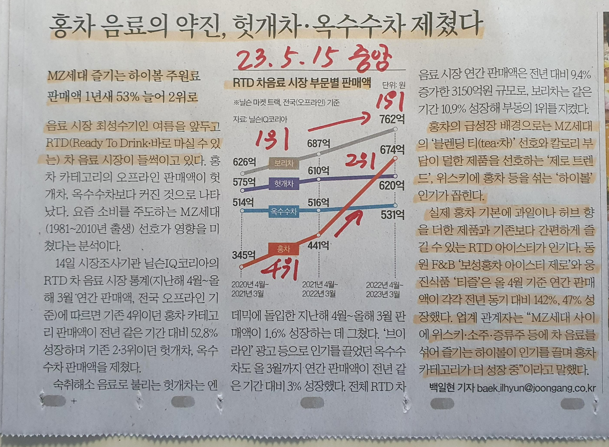 -RTD(Readu To Drink) 음료의 대표는 과거에는 보리음료와 아침햇살, 2010년 이후에는 헛개차와 옥수수차 그리고 2023년에는 홍차가 눈에 띄는 성장세를 가지고 있다.