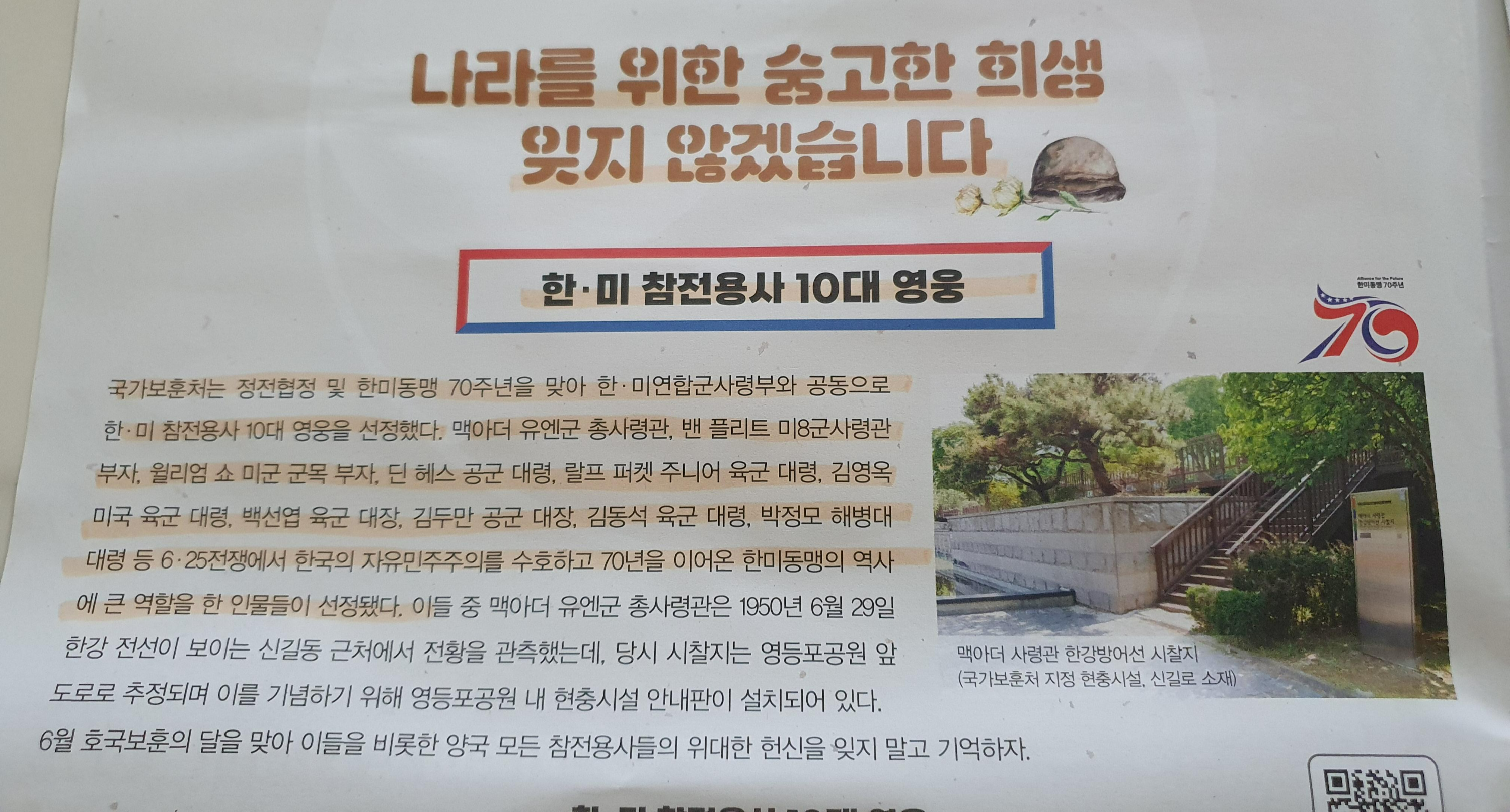 국가보훈처는 정전협정 및 한미동맹 70주년을 맞아 한미연합군사령부와 공동으로 대한민국의 자유 수호에 ...