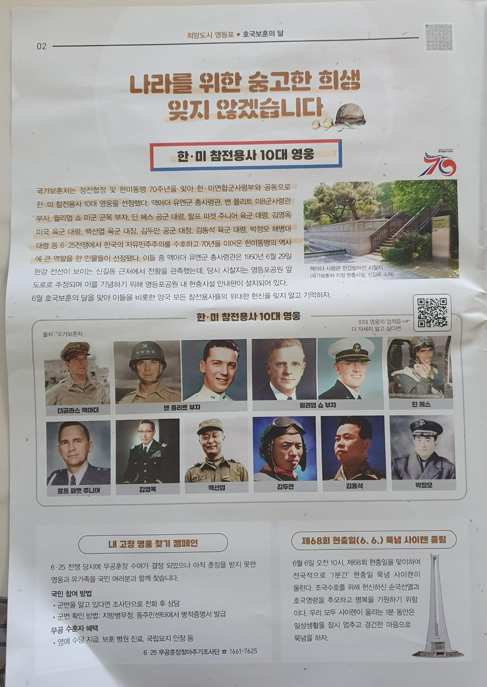 영등포 지역 뉴스를 보며 스크립트한 한/미 참전용사 10대 용사에 대한 리스트와