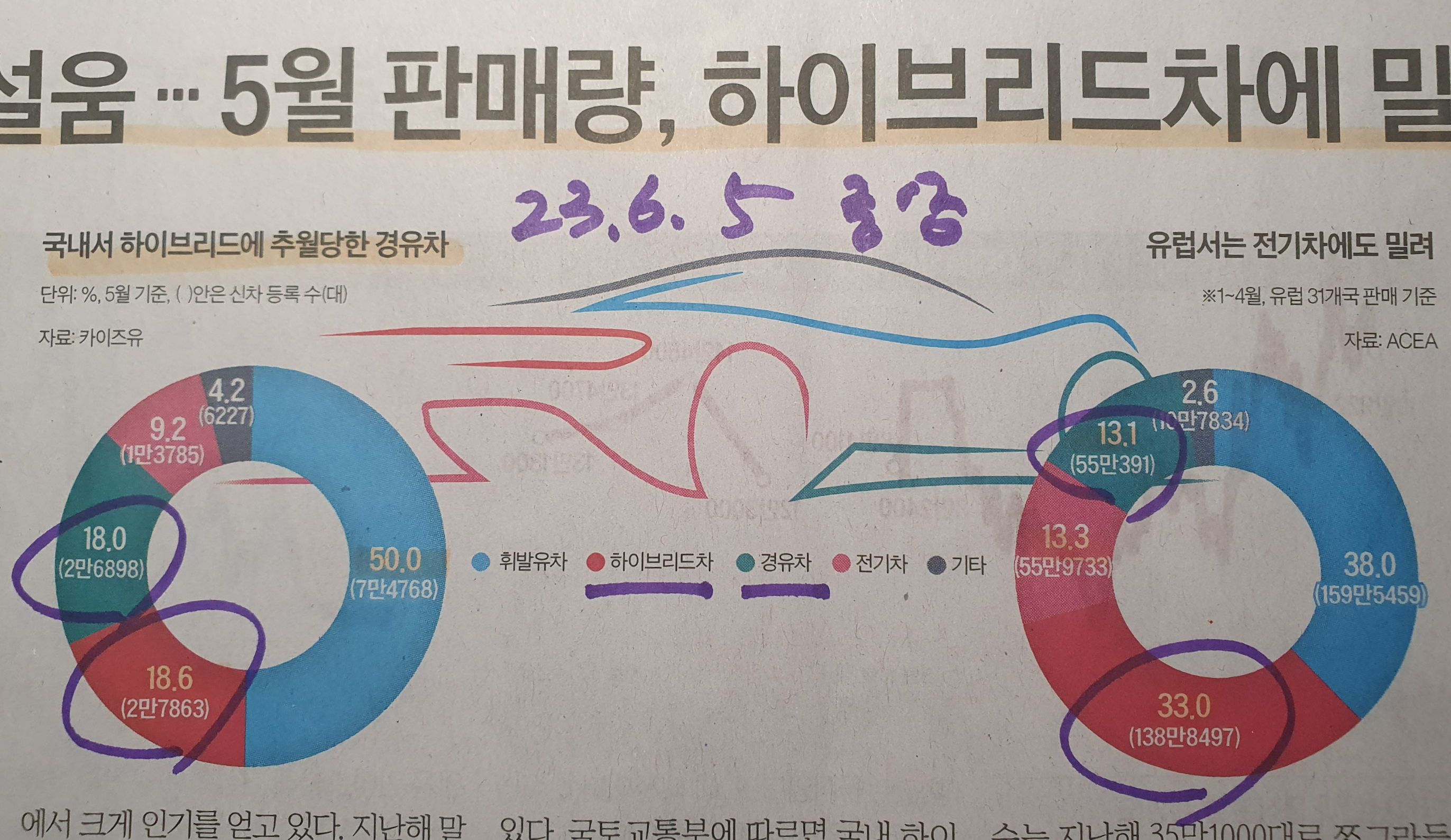 -한국, 국내에서도 5월 기준 하이브리드차 18.6%, 경유차 18%로 간발의 차이로 하이브리드 차량의 비중이 앞서는 상황으로 시간이 갈 수록 차이가 커질 것으로 예상