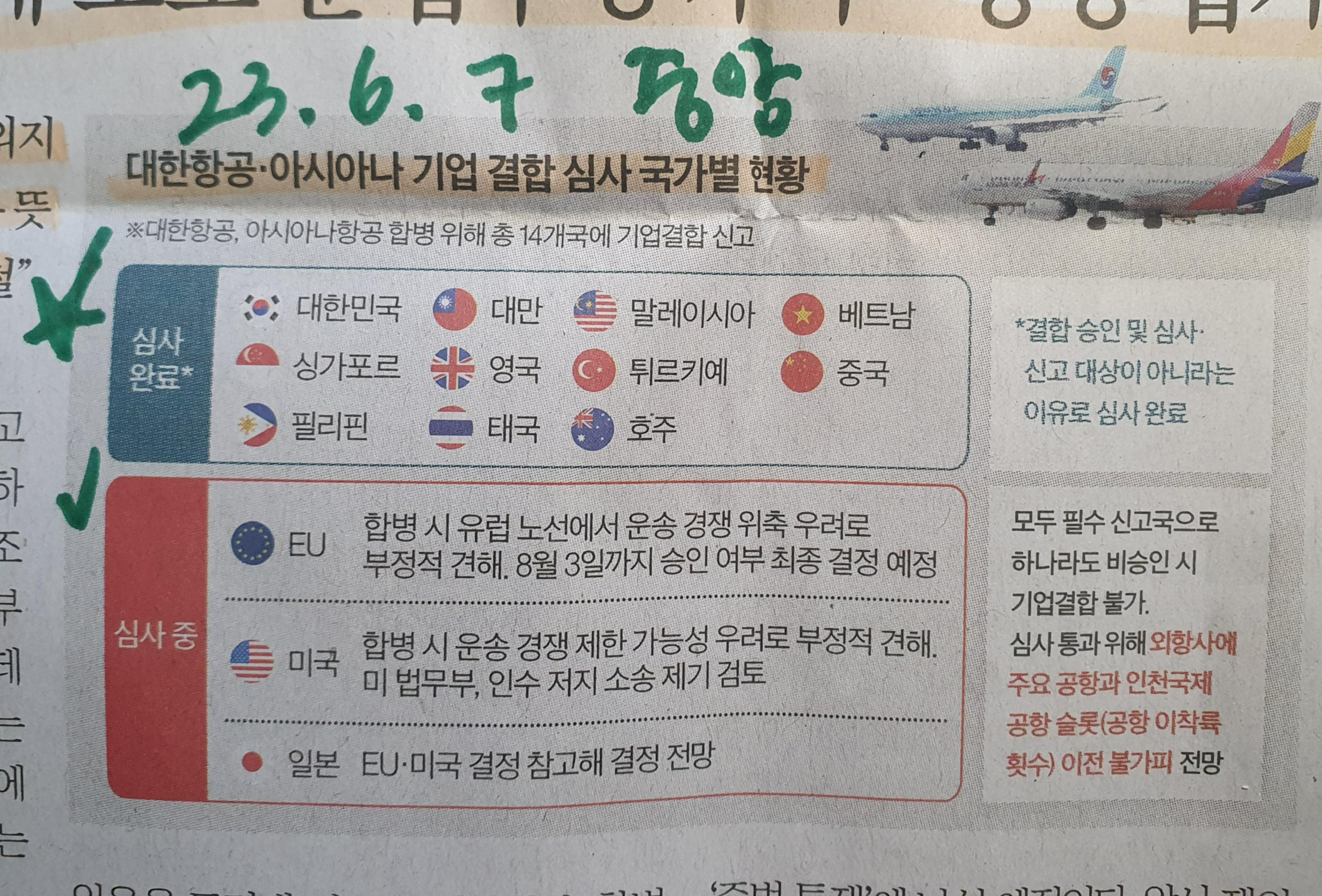 -대한항공의 아시아나 합병 관련 사항이 뉴스에 나온 지 1년이 훌쩍 넘었지만 국가별 심사 미승인으로 아직도 최종 합병은 결정되고 있지 않다.