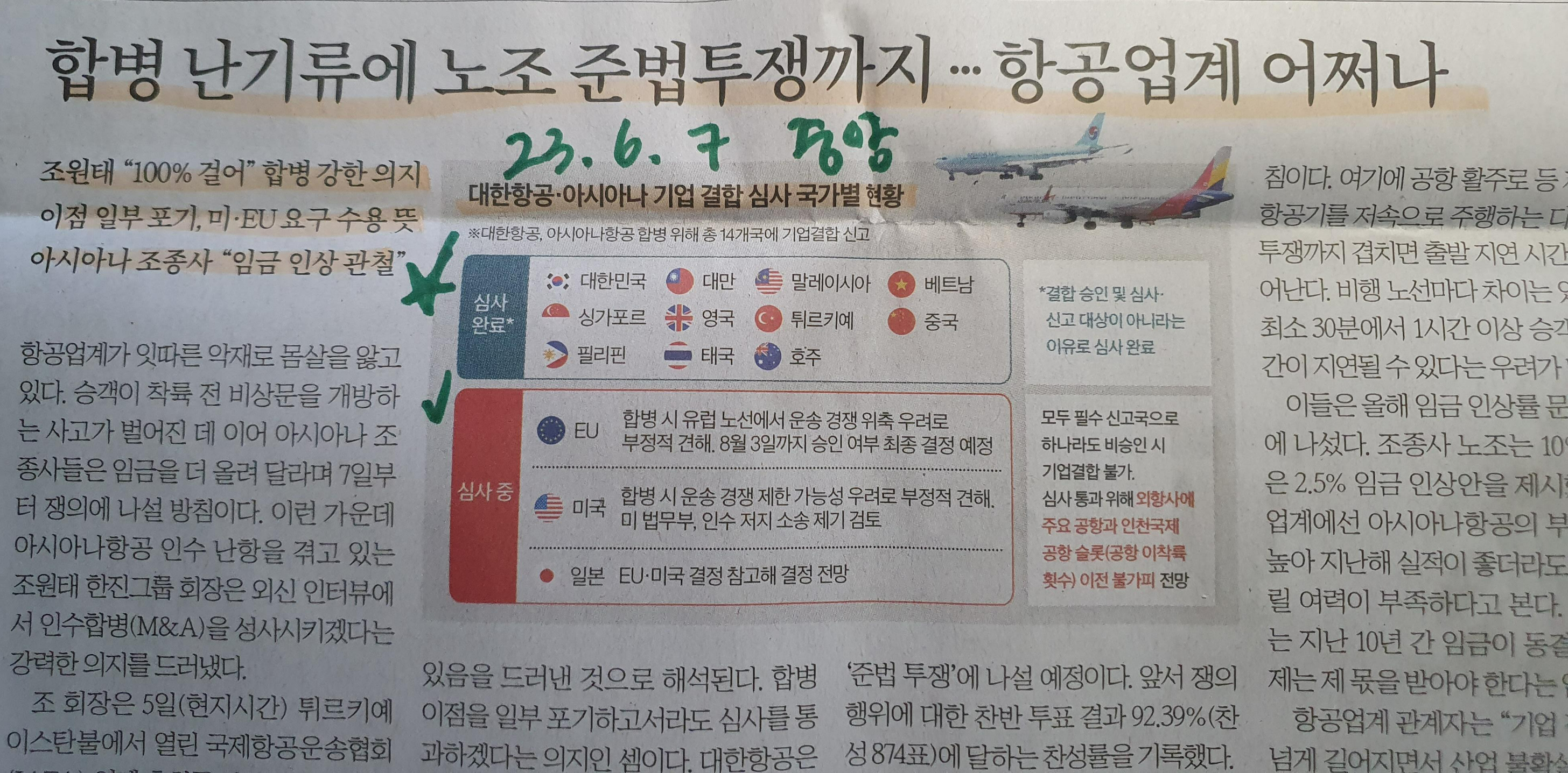 Comment)) 처음 합병 당시부터 EU 와 미국의 강한 반대가 있으리라 생각되었는데 1년 넘는 시간 동안 지지 부진한 상태. 아시아나의 경우 문개방 사건부터 조종사 임금인상과 노동환경 개선이라는 마찰 등 쉽지 않은 2023년을 보내고 있는 상태이다. 예상은 결국 합병은 이루리라 생각되지만 알짜노선을 얼마나 내어주지 않고 그리고 외항사의 슬랏 관리를 할 수 있을지에 따라 평가가 이루어질 것으로 예상된다.