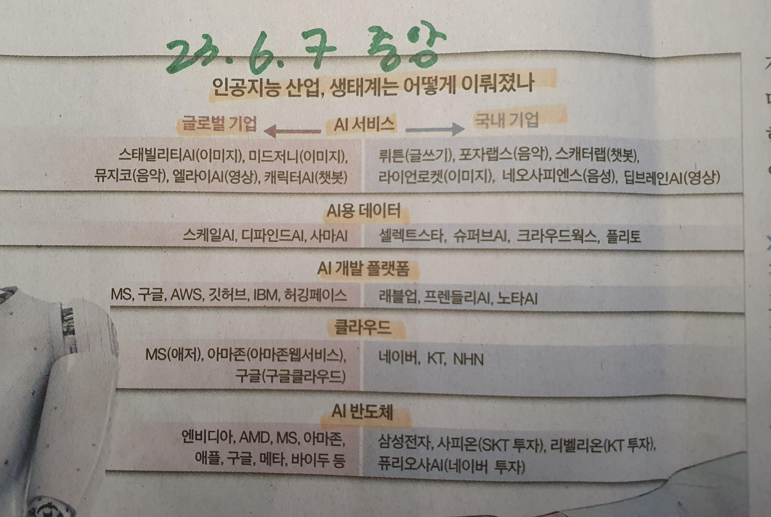 Comment)) 이미 미국과 한국에서는 스타트업으로 AI 기업들이 성장하는 중, 특히 통신이나 대기업에 투자를 하는 기술력을 키워나가는 기업들이 많은 상황. 중국의 경우 이미 AI 산업에 대한 막대한 투자를 통해 미국과의 격차가 많이 좁혀 한국과 유럽 기술을 넘어서는 수준으로 발전. 정리를 하면 기술발전은 국가별, 사용자별에 따라 다양한 형태의 생태계가 발전될 것이라는 예상. 아직까지는 눈에 띄게 성장하는 기업은 안 보여 귀추가 주목.