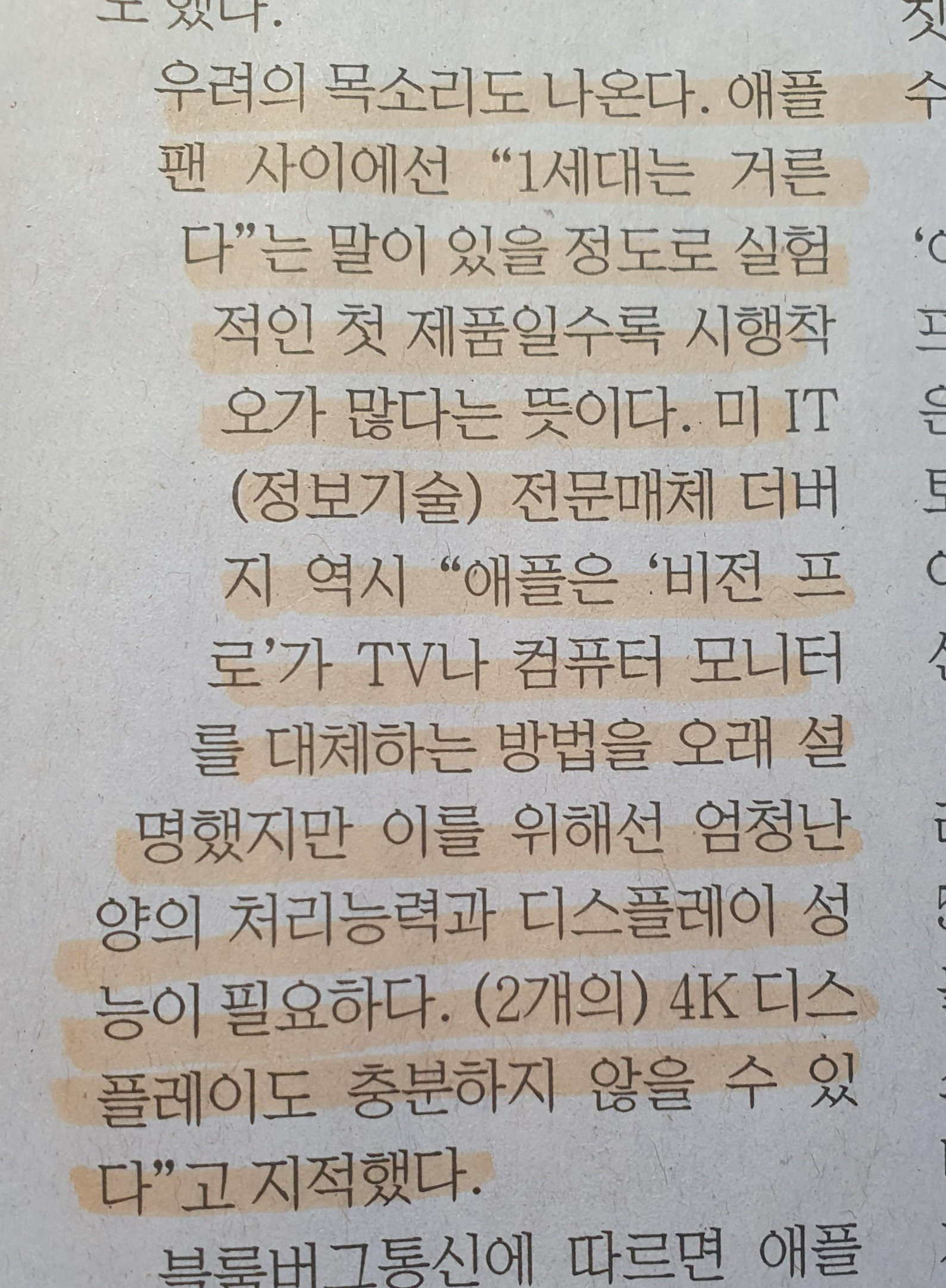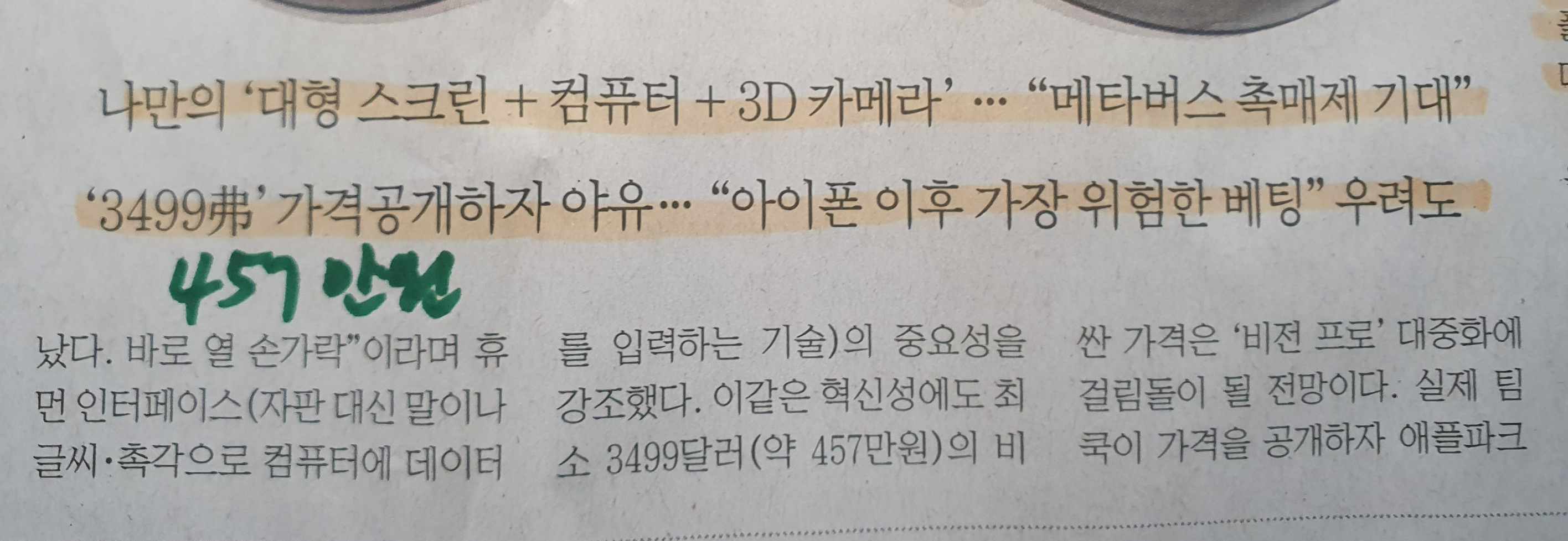 -반면 처음 나오는 1세대 제품이 450만 원이 넘는 가격에 판매되는 것은, 400만 원짜리 얼리어답터로 시행착오를 감수하고 사기에는 부담스러운 가격이다. 또한 현재의 기술력으로 애플의 비전프로가 효용성이 있을지에 대한 의문점도 있다.