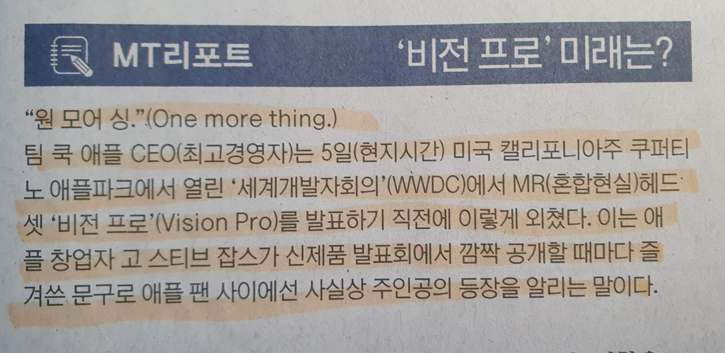 애플 '비전 프로 Vision Pro' MR(혼합현실)의 새로운 시대를 만들까? 23.6.7 머투