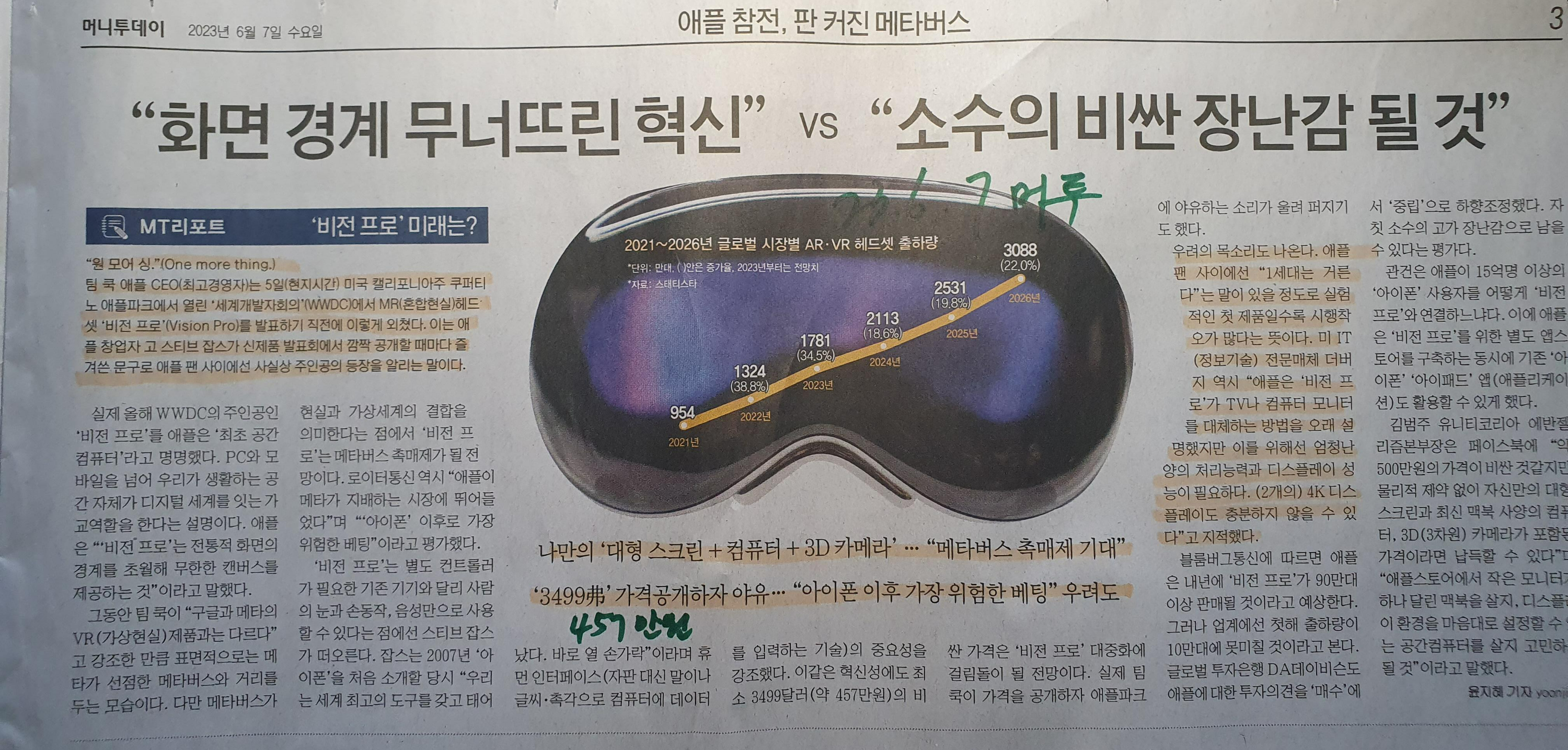 -팀 쿡 애플CEO는 비전프로의 소개와 함께 가격, 성능, 그리고 기능성에 대한 다양한 이야기를 만들어주고 있다. 기존의 대표 AR 제품인 메타의 제품과는 가격과 결이 다른 제품을 보여줄지 궁금해진다.