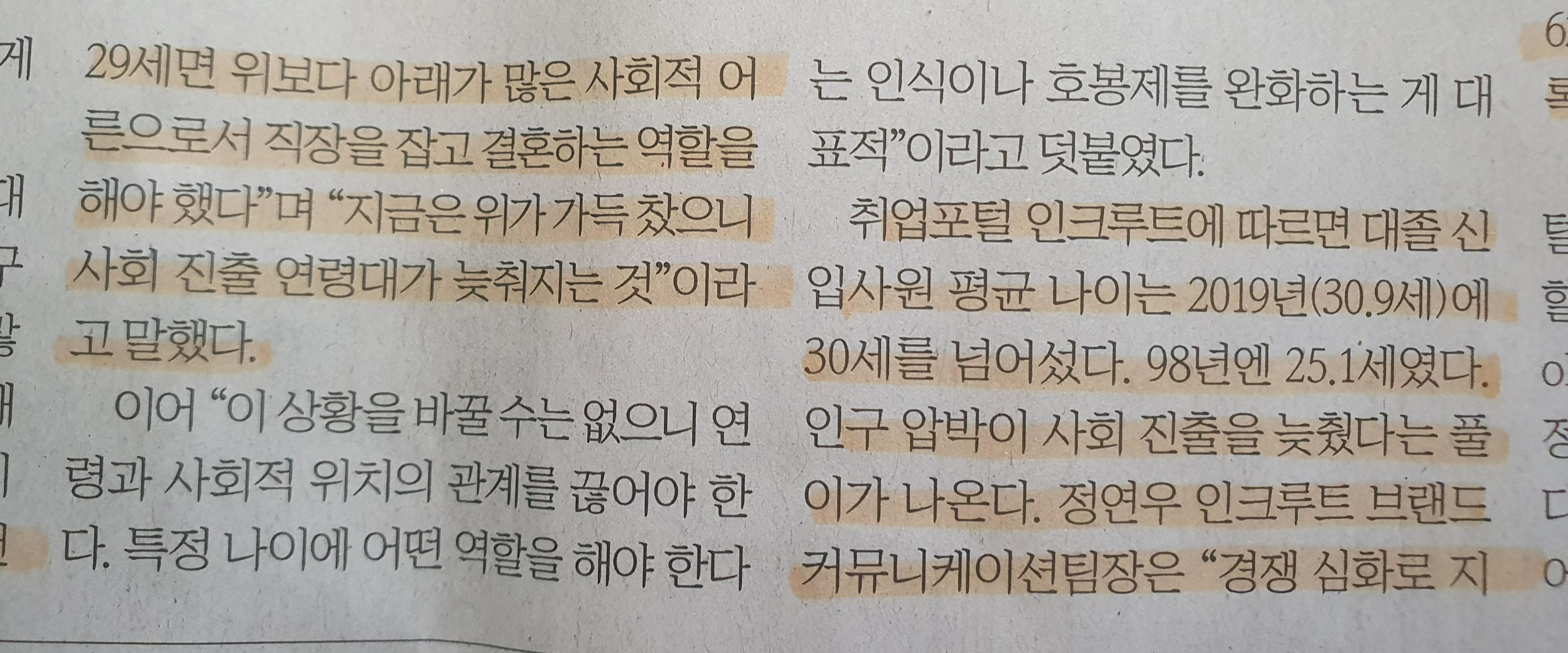 -대졸 신입사원 평균 나이는 98년엔 25.1세에서 2019년 30.9세로 평균 31세의 나이로 늦춰졌다. -> "경쟁 심화로 지금의 신입사원 평균 나이는 더 높아졌을 것으로 추정된다" "사회생활의 시작이 그만큼 늦어졌다는 의미" / 정연우 인크루트 브랜드 커뮤니케이션팀장님