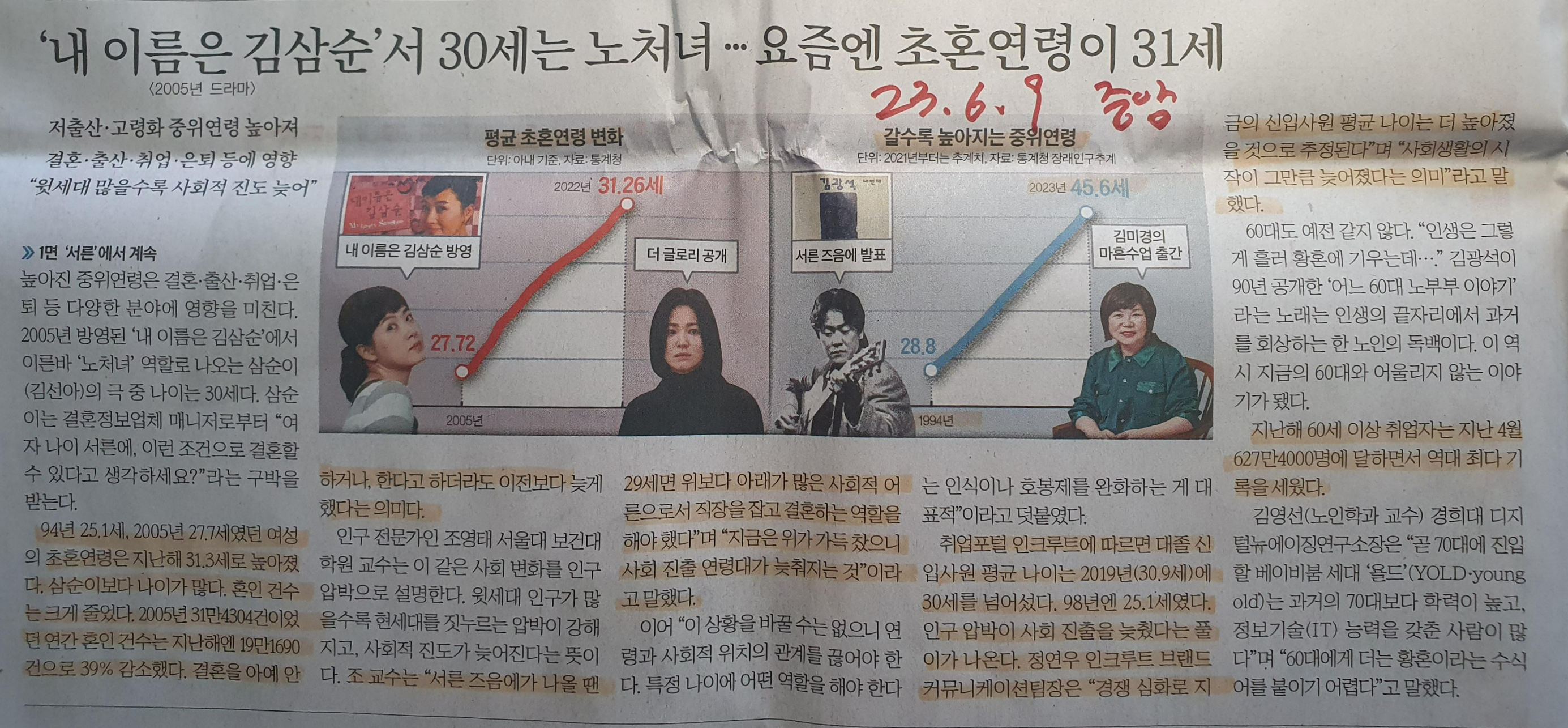 Comment)) 2023년 시대의 흐름이 많이 바뀐 것이 체감된다. 과거의 내 이름은 김삼순 노처녀가 29세였다니.. 지금의 29세면 아직 너무 젊은 나이로 느껴지는데 그때 당시의 27.72세의 결혼 적령기 기준으로는 노처녀가 맞다. 서른 즈음에 명곡의 지금의 40대와 같은 인생의 전환기와 같은 마음으로 만들어진 곡. 2022년 읽은 책 중에서 김미경선생님의 마흔 수업 책을 통해서 마흔이라는 카테고리가 절정에서 내려가기 시작하는 것이 아닌 이제 다시 정비하고 60대와 70대를 맞이하기 위해 뛰어야 하는 시대라는 것이 마음에 와닿은 책자였다. 시대의 변화 속에서 나의 고정관념과 변화된 삶을 얼마나 빠르게 받아들이고 변화시킬 수 있는 것이 중요한 전환점이라 생각된다.