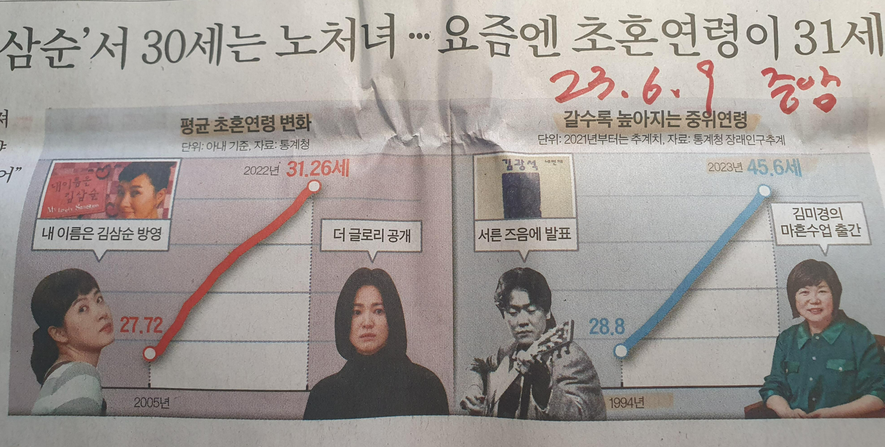 -평균 결혼 연령 94년 25.1세, 2005년 27.7세, 2022년 기준 31.3세
