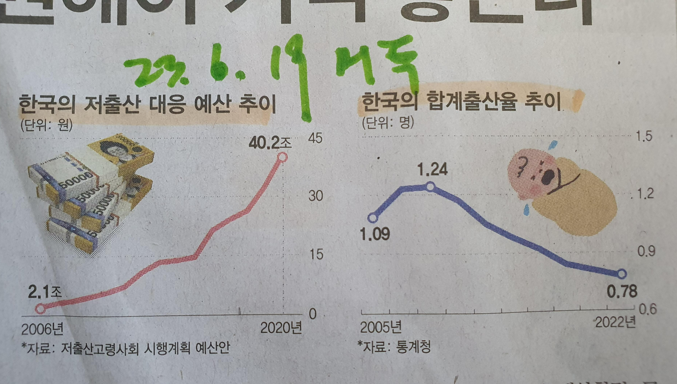 한국 저출산 대응 예산 2020년 40조, 한국의 합계 출산율 0.78명 23.6.19 머투