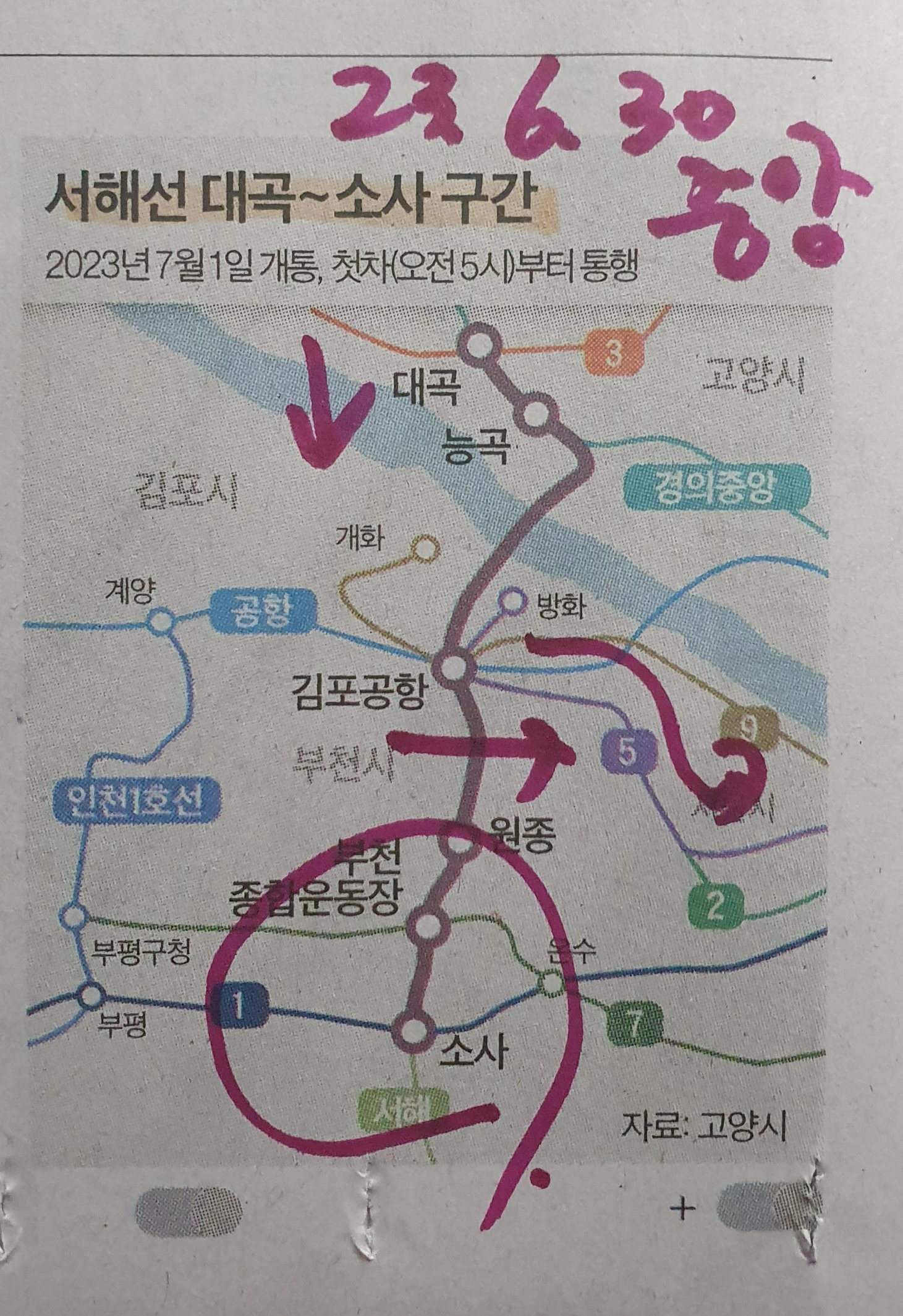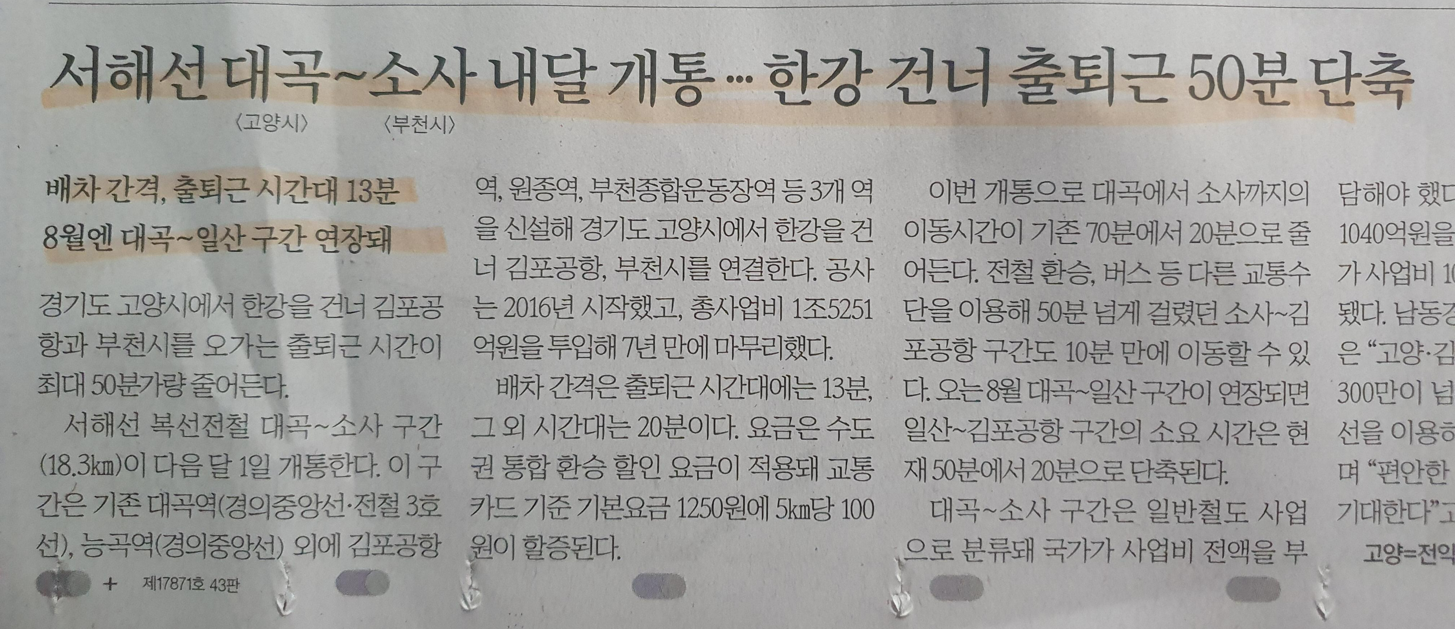 -서해선 대곡(고양시)~ 소사(부천시) , 7월1일 부터 개통