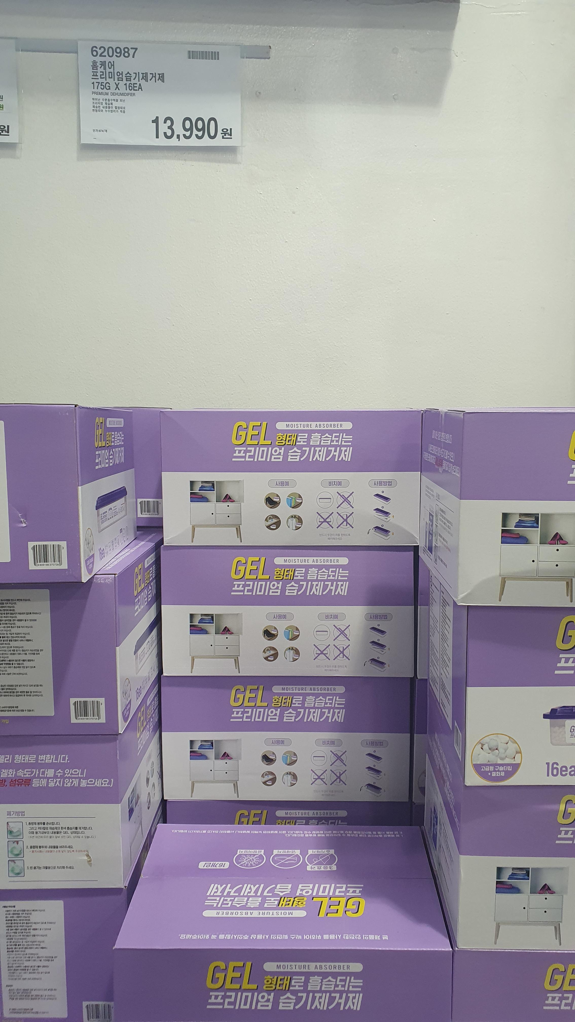 뛰어난 수분흡수력을 지닌 프리미엄 제습제, 제습된 내용물들은 액체 형태가 아닌 GEL 형태로 변형되어 보관시의 누수 염러가 적은 제품. 16개에 1.4만원 정도라면 개당 1천원이 안되는 다이소에서 낱개로 구입하는 경우보다도 싼 용량과 판매 갯수 입니다. 다이소에서 10개 정도를 구매했는데 이 가격에 용량이면 코스트코에서 구입할 걸 아쉬웠습니다.