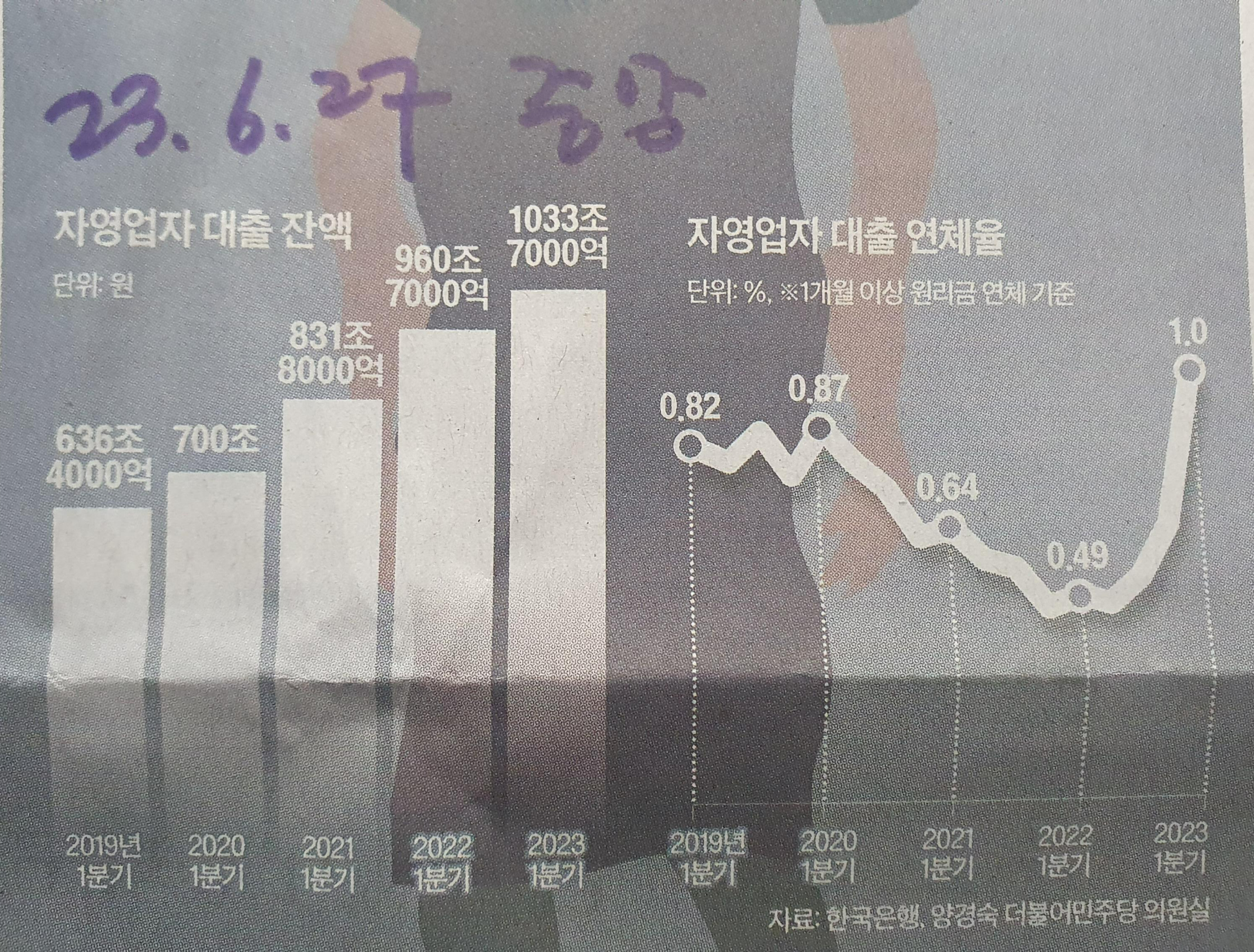 Comment)) 코로나를 겪으며 버티고 2023년을 맞이한 자영업자분들에게는 큰 힘든 시간으로 보인다. 2019년 대기 636조에서 2023년 1033조가 넘어 거의 2배의 대출 잔액에 육박한다. 기업들에게는 수출 감소로 인한 고통과 자영업자에게는 빚의 고통이 나날이 상승하고 있는 상황.
