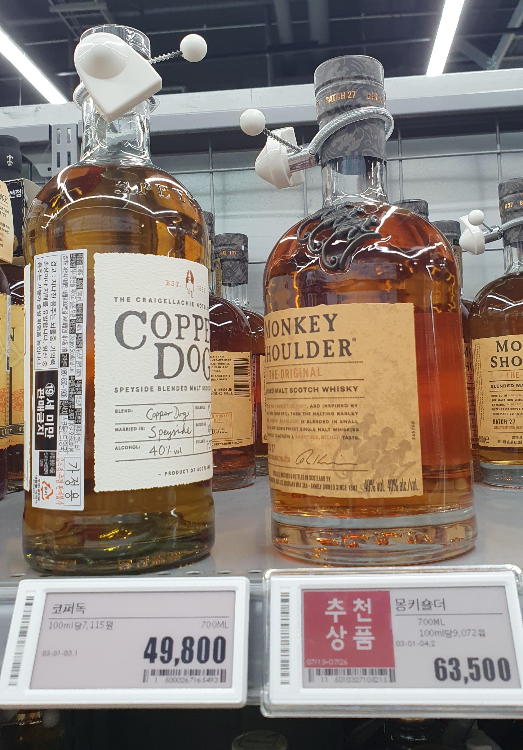 할인은 아니지만 마셔본 제품이라 포스팅합니다. 코퍼독은 칵테일과 같은 하이볼 형태로 유명한 주류이며 몽키숄더는 마셔보면 부드러움과 깊은 맛에 눈이 떠지는 위스키라 추천합니다.