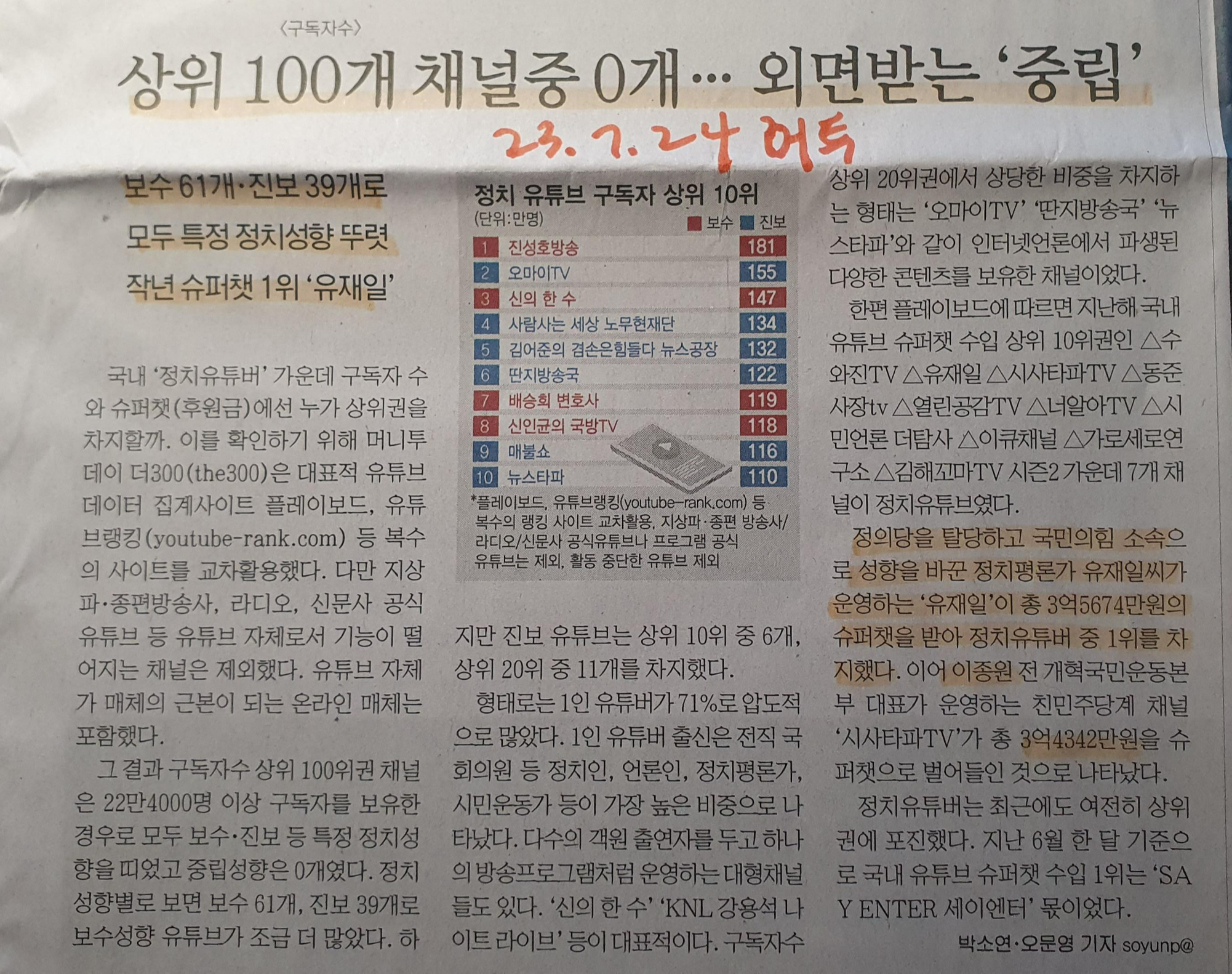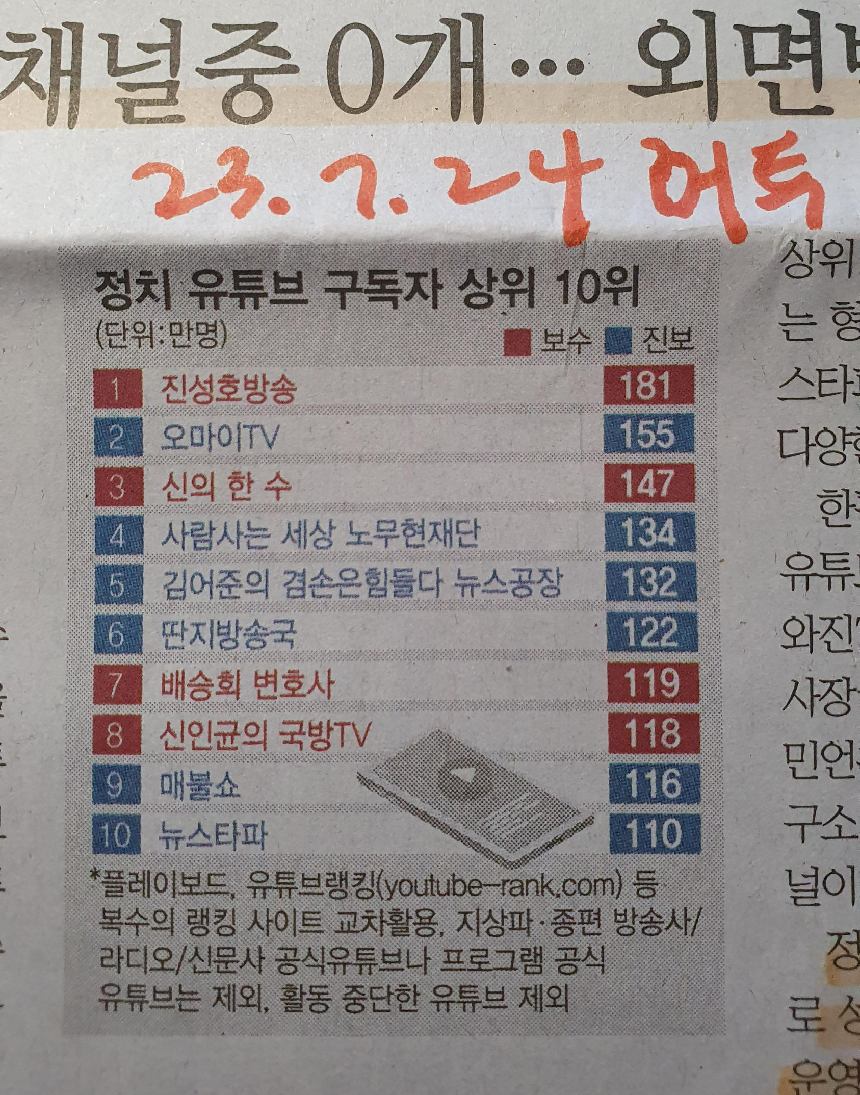 정치 유튜브 구독자 상위 10위 23.7.24 머투