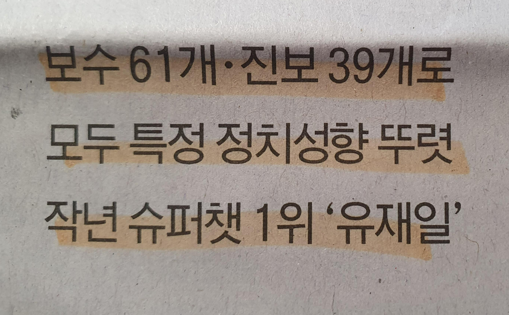 Comment)) 정치 유튜브를 하는 이유는 가장 빠르게 팬층을 끌어 모을 수 있다는 것이라 생각된다. 채널 자체는 보수 관련 유튜브가 많지만 상위10위로 압축하면 진보 6 : 보수 4의 랭킹으로 엇비슷한 상황이다. 중립적인 채널이 외면받는 이유는 유튜브의 특성상 진보든 보수든 관심있는 사람이 유튜브 채널을 구독, 도네를 하며 중립의 경우 구독의 이유가 구지 없기에 적어도 두 진영중 한가지 색깔을 보여주어야만 팬층을 확보 할 수 있는 부분이라 생각된다.