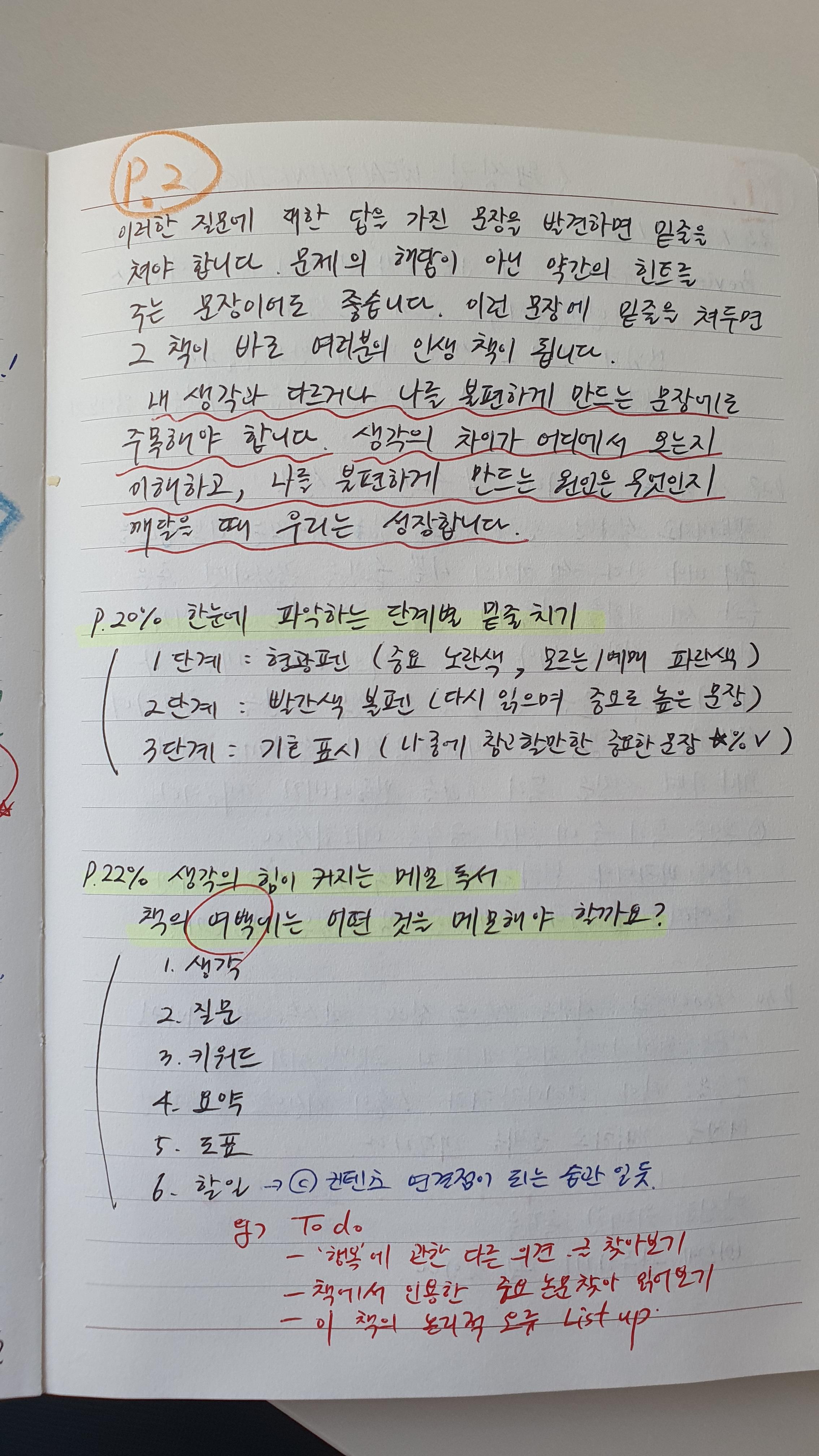 이러한 질문에 대한 답을 가진 문장을 발견하면 밑줄을 쳐야 합니다. 문제의 해답이 아닌 약간의 힌트를 주는 문장이어도 좋습니다. 이런 문장에 밑줄을 쳐두면 그 책이 바로 여러분의 인생 책이 됩니다.