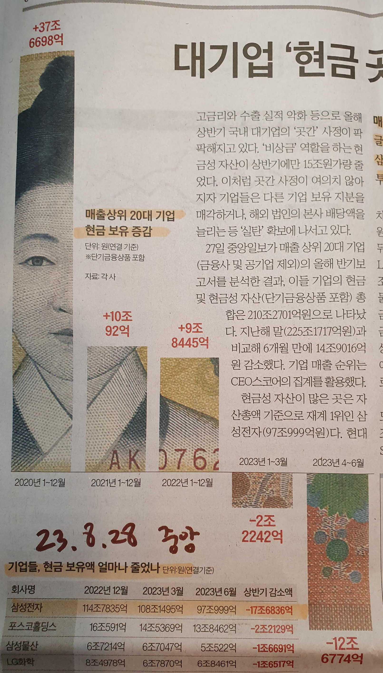대기업 현금 보유액 증감 상황, 현금성 자산 분석 23.8.28 중앙