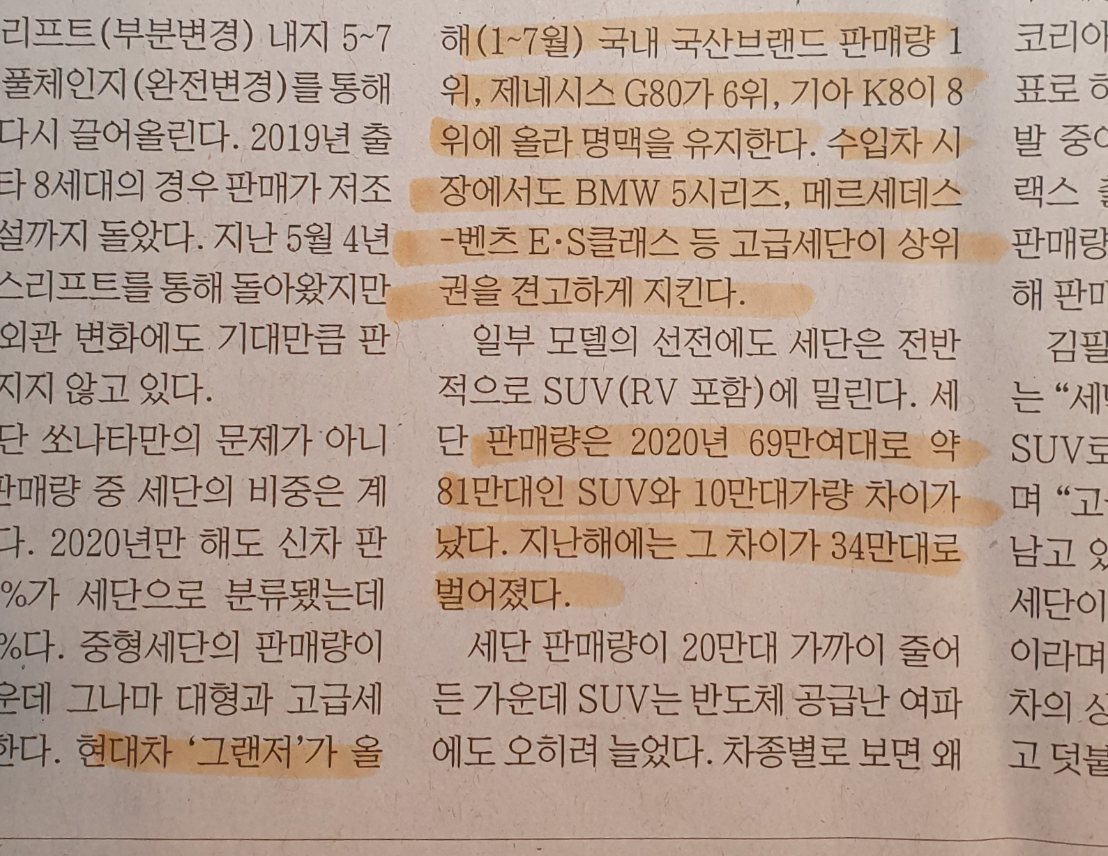 -세단의 부진은 결국 빈익빈 부익부 준중형과 중형의 큰 감소와 비교하여 제네시스, 기아K8, 그랜져 이상급의 차량들은 판매가 꾸준한 상태이다. 상향평준화?