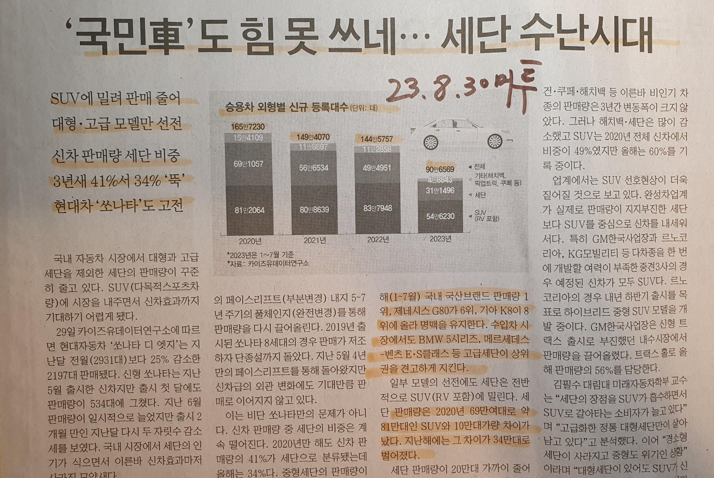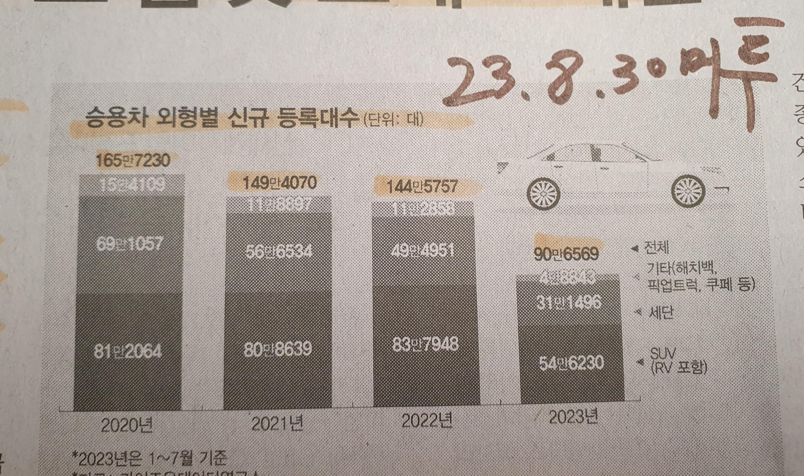 승용차 외형별 신규 등록, 세단은 하락 SUV는 견고 23.8.30 머투