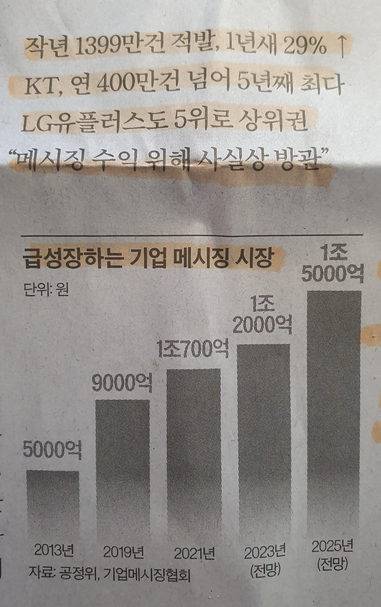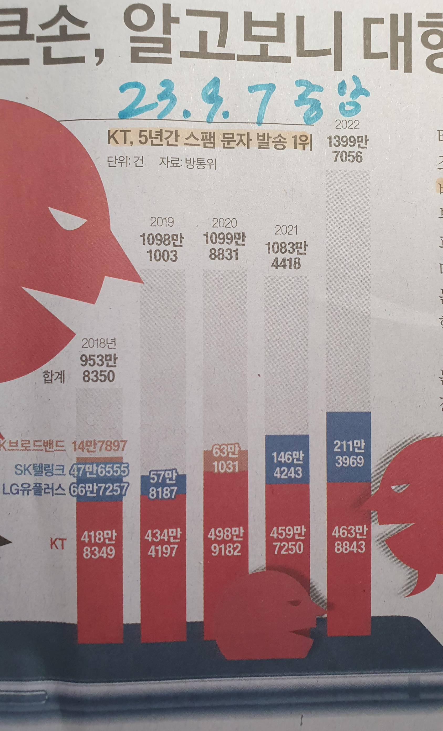 스팸 문자 1위는 KT?! 급 성장하는 기업 메시징 시장의 명암 23.9.7 중앙