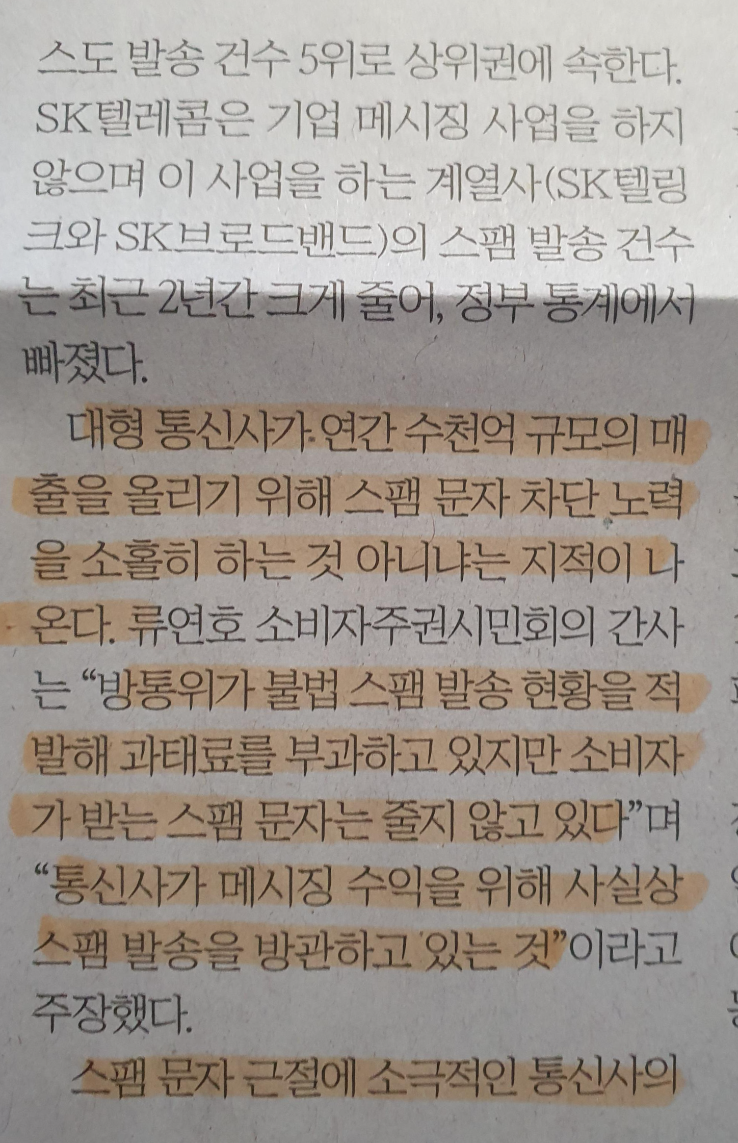 Comment)) 스마트폰을 쓰다보면 스팸문자가 이제는 거의 매일 오고 있다. 특히 선물이나 사행성 투자 관련 문자들에 지속적으로 노출되는 경우 사회 전반적인 악영향이 예상된다. 특히 통신 3사의 방관은 기업으로서의 최소한의 윤리없이 메세징 사업으로 돈을 버는 것에만 치우친 행태라 생각된다.