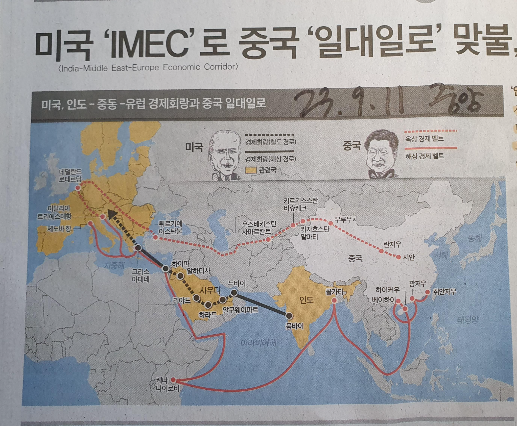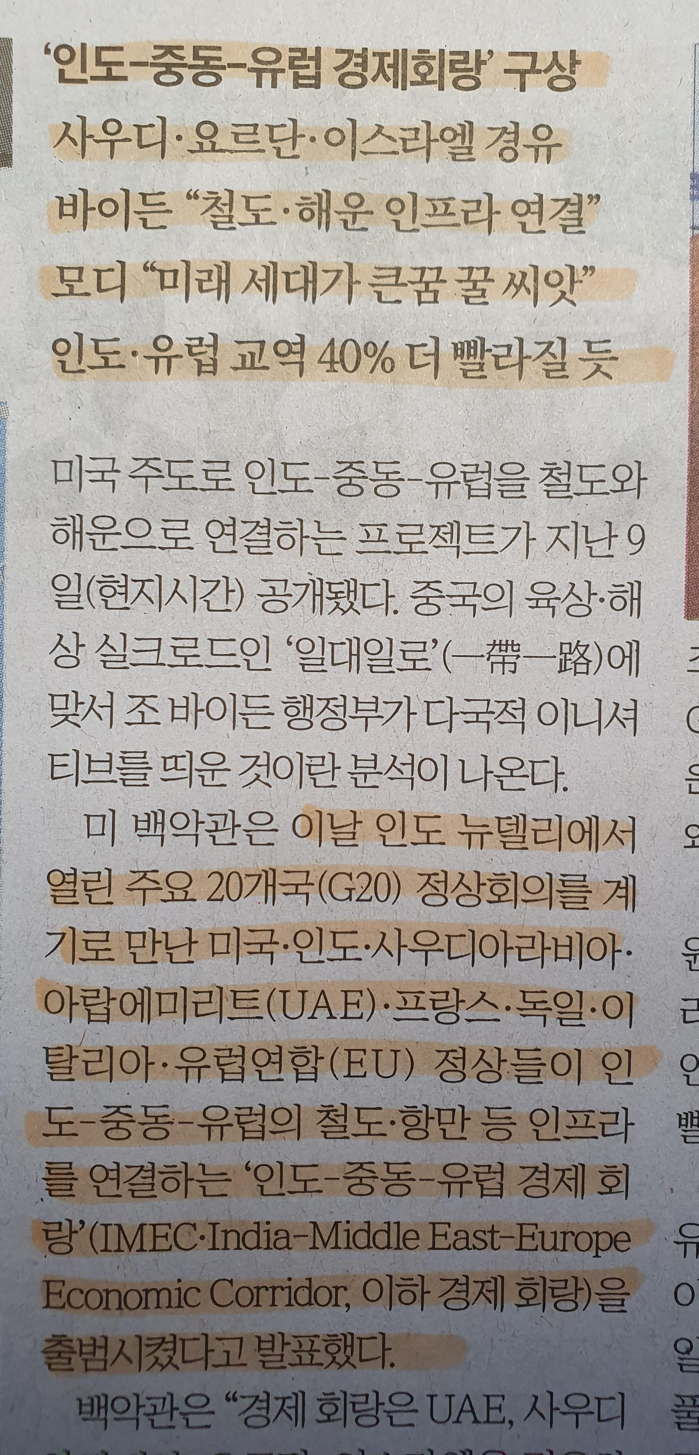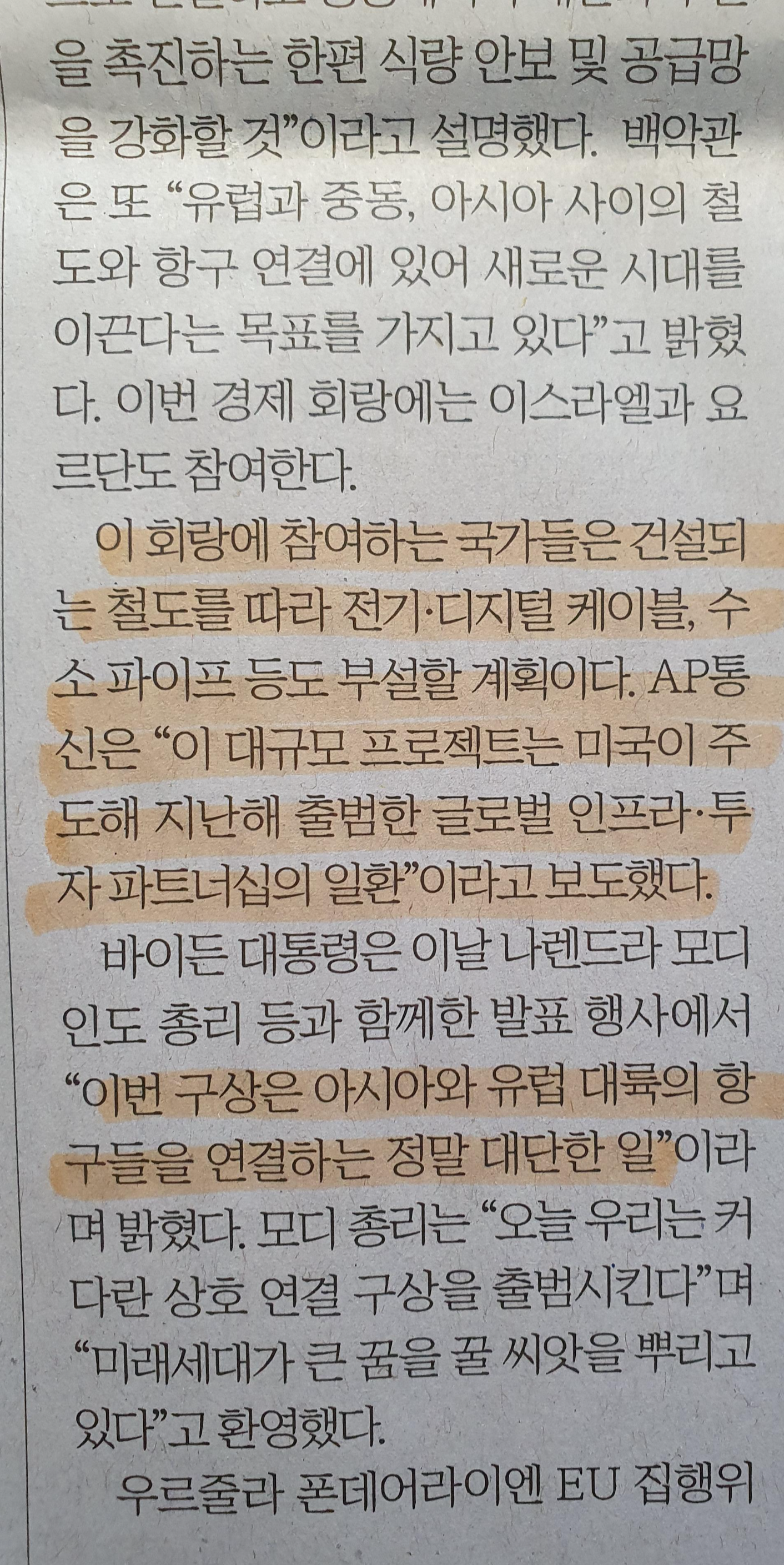 -미국의 인도-중동-유럽 경제회랑 구상, 바이든 "철도, 해운 인프라 연결"
