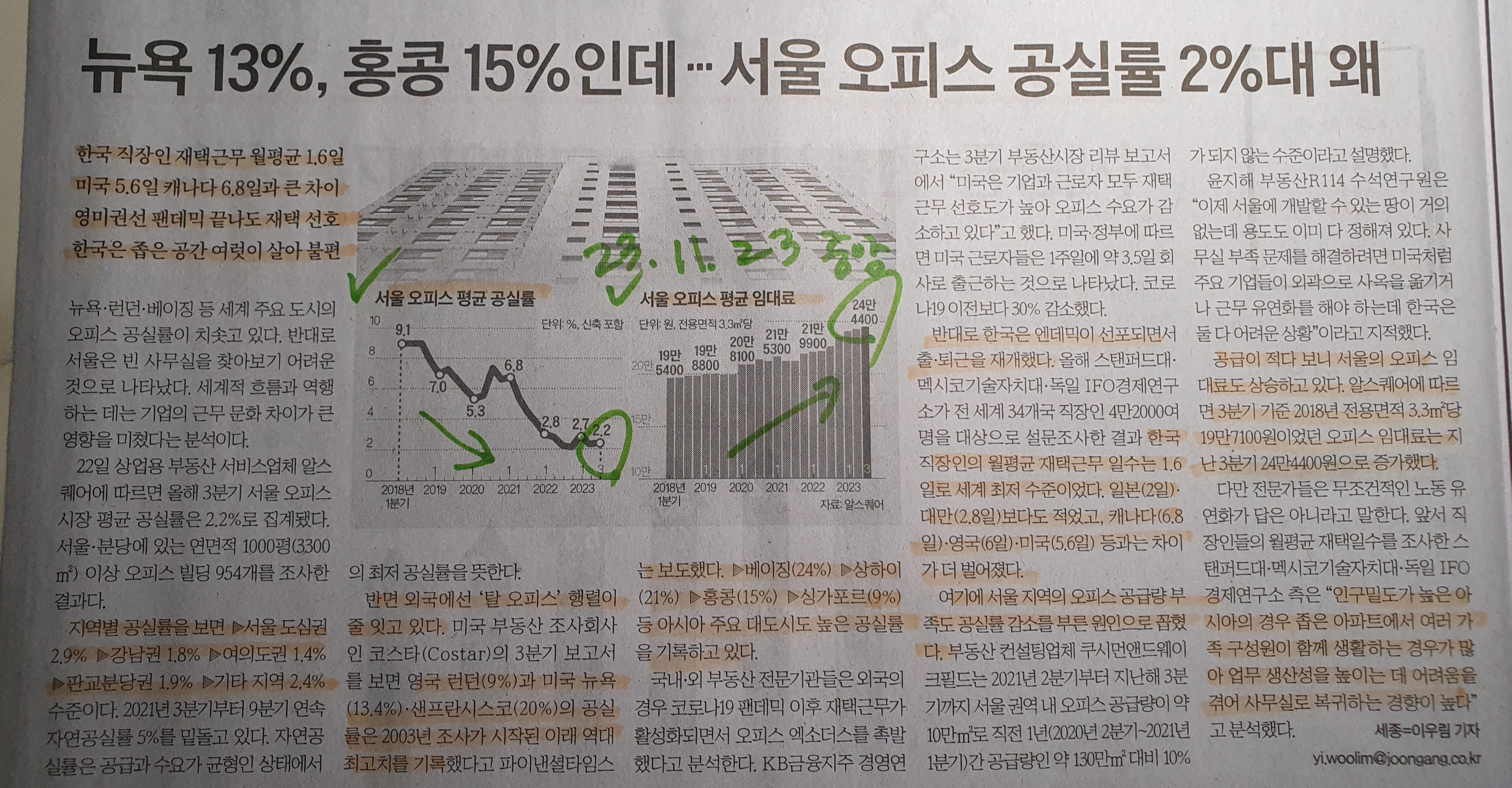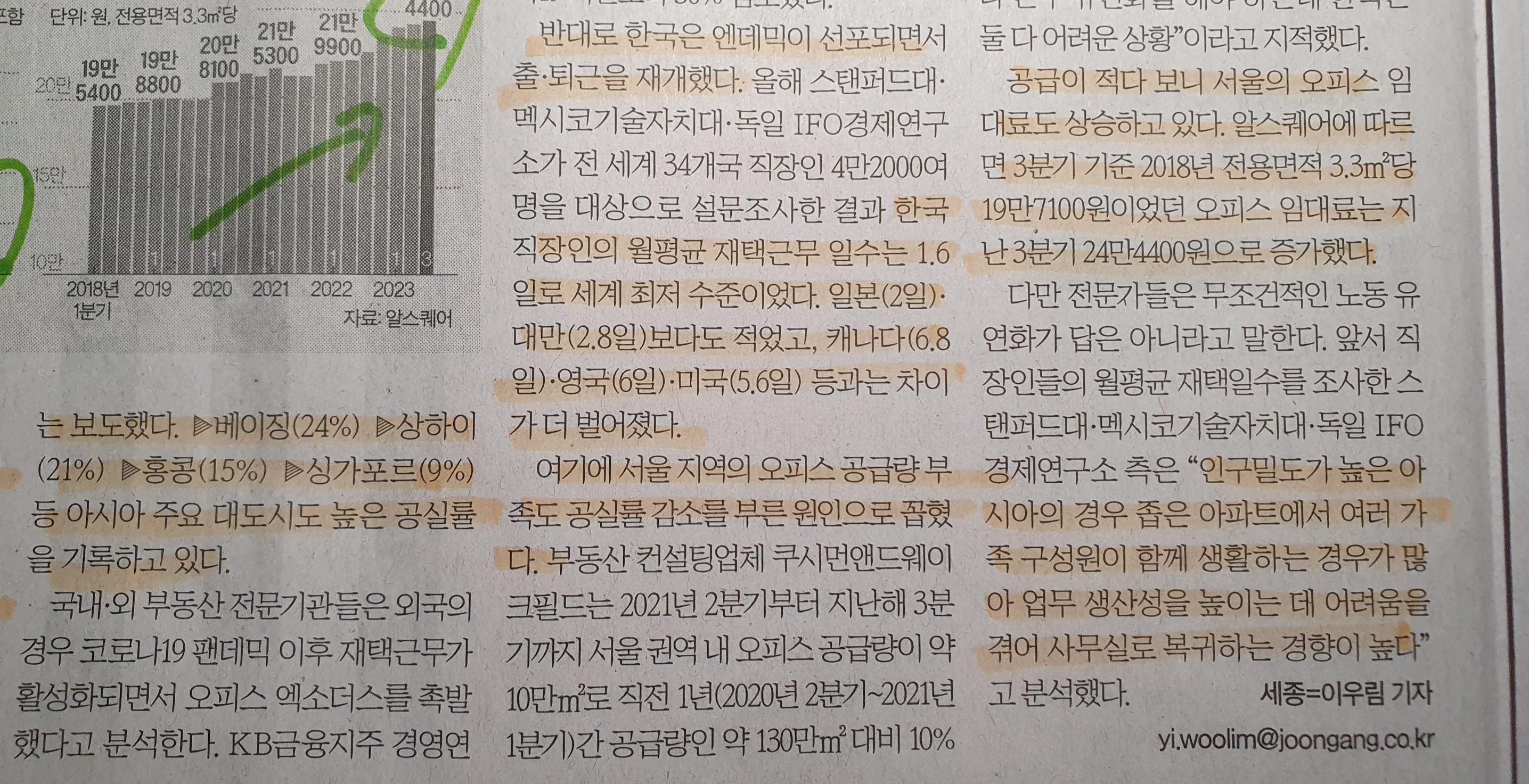 -하지만 한국은 밀집형의 도시 특성인지 코로나 이후 높았던 공실률이 코로나 이후 6.8%까지 높았던 부분이 2.2%까지 줄어들어 역대 최저 수준, 이에 따라 평균 임대료도 코로나 이후 기준 평당 24만 원까지 올라간 상태이다.