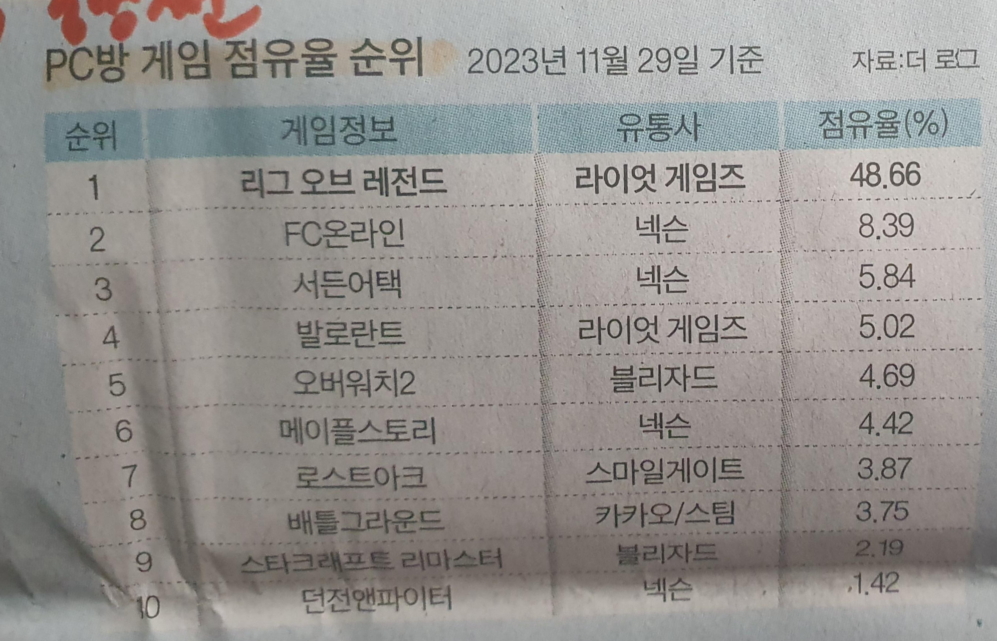 -PC방 게임 점유율 순위, 리그 오브 레전드, FC 온라인을 제외하고서라도 언제 적 서든어택과, 메이플스토리, 스타크래프트,,,, 정말 고인 물들의 높은 시장 장벽이 느껴지는 점유율 순위이다. 한때 폭풍적 인기로 많은 사람을 끌아모았던 오버워치와 배틀그라운드는 현재 5,8위로 선전 중이지만 3~4%대의 낮은 점유율, 48.66%라는 50퍼센트 가까운 인기는 역시나 오랜 기간 동안 왕자에서 내려오고 있지 않은 리그 오브 레전드, LOL 롤의 파워가 눈에 띈다.