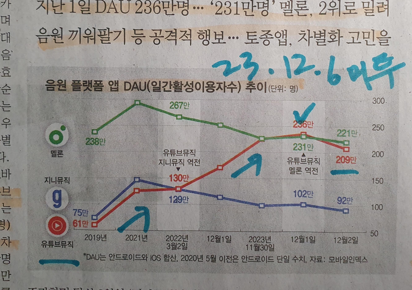 -12월초 만년 1위 음악 스트리밍 서비스 멜론을 넘어서기도 한 상황