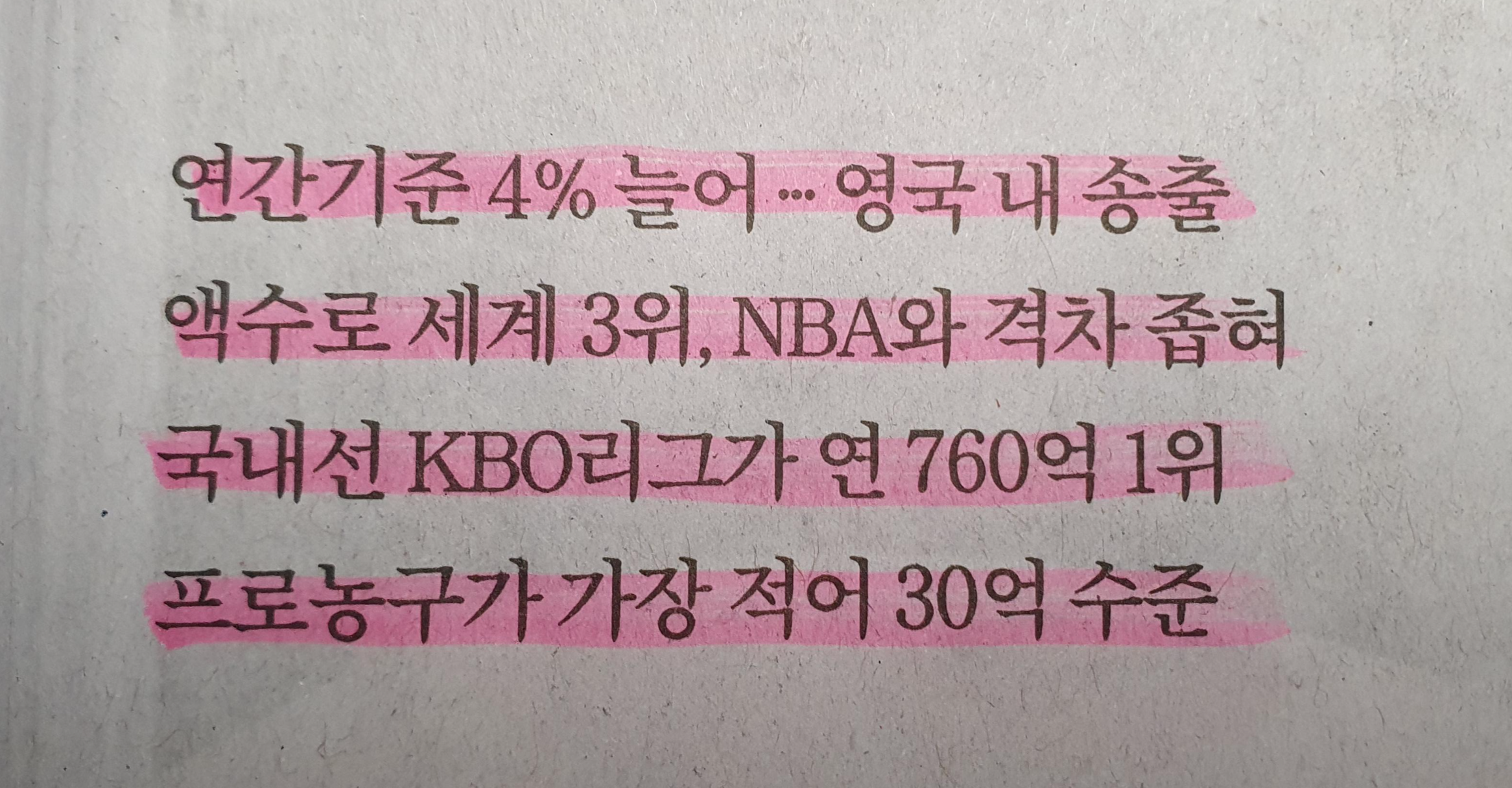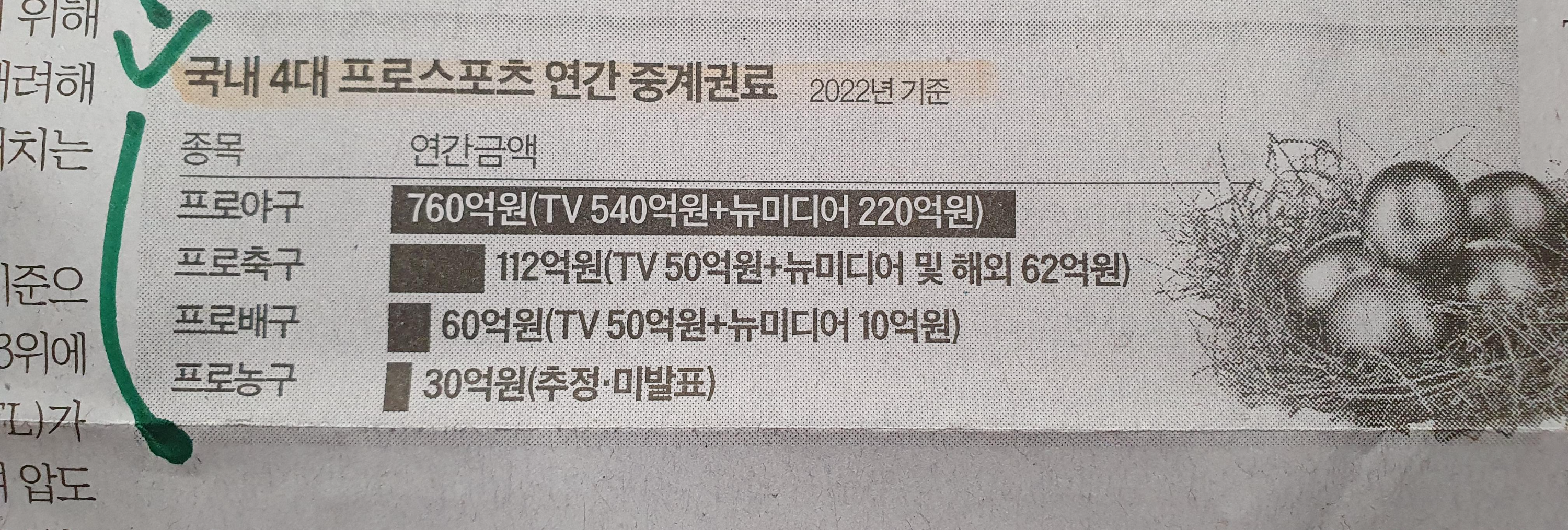 -국내는 역시나 야구, 매니아층과 충성 시청자가 많은 스포츠이기에 760억 원으로 가장 높은 중계권료이며 축구와 배구는 명색적인 느낌. 프로농구의 인기하락은 30억 원이라는 프로배구에도 밀리는 상황이라는 것이 중계권료를 통해 알게 해 준다.
