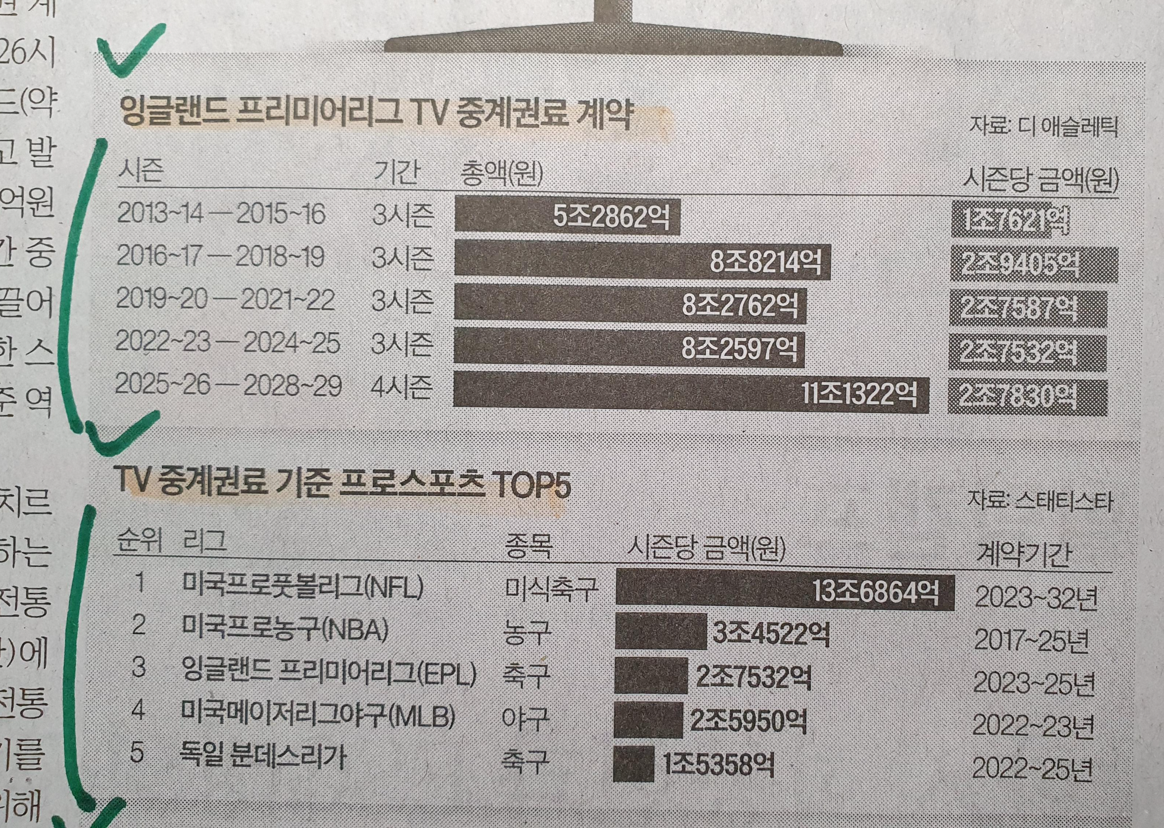 잉글랜드 프리미어리그 TV 중계권료, 글로발 기준 TV 중계권료 톱5, 국내 프로스포츠 연간 중계권료 23.12. 중앙