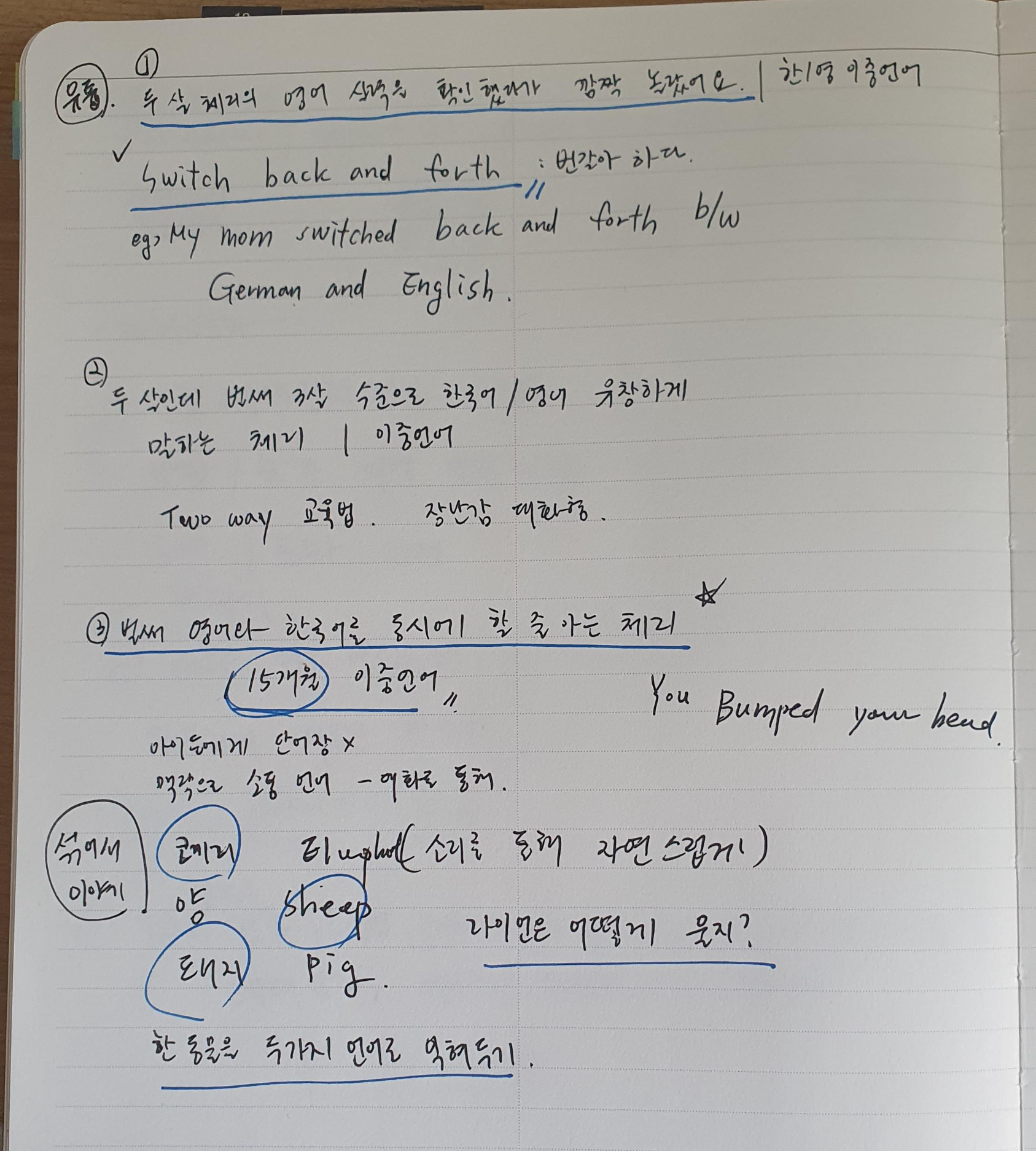 "라이언은 어떻게 울지?"와 같이 영어와 한국어를 한번에 사용하여 Switch back and forth 하여 언어에 대한 이중언어 감각을 키워주는것 답은 한국어나 영어가 아닌 연상되는 동물의 소리로 답하여 자연스러운 습득을 유도한다.