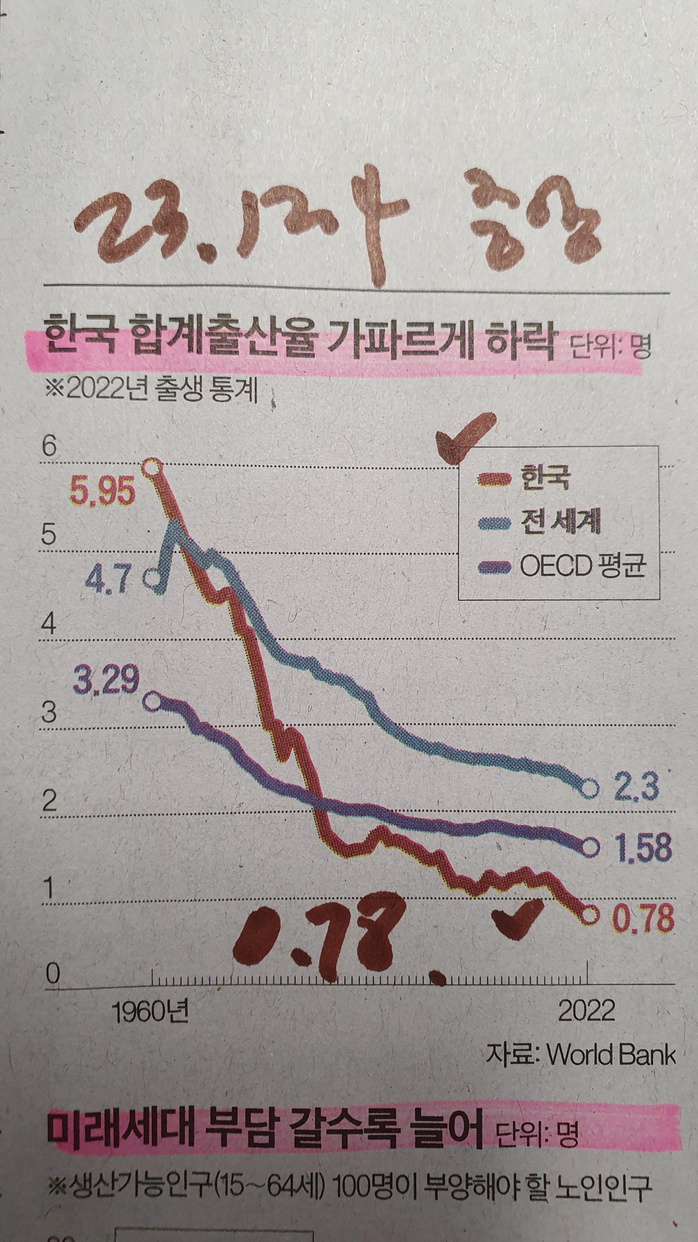 2023.06.24 - [MONEY & TREND LOG] - 한국 저출산 대응 예산 2020년 40조, 한국의 합계 출산율 0.78명 23.6.19 머투