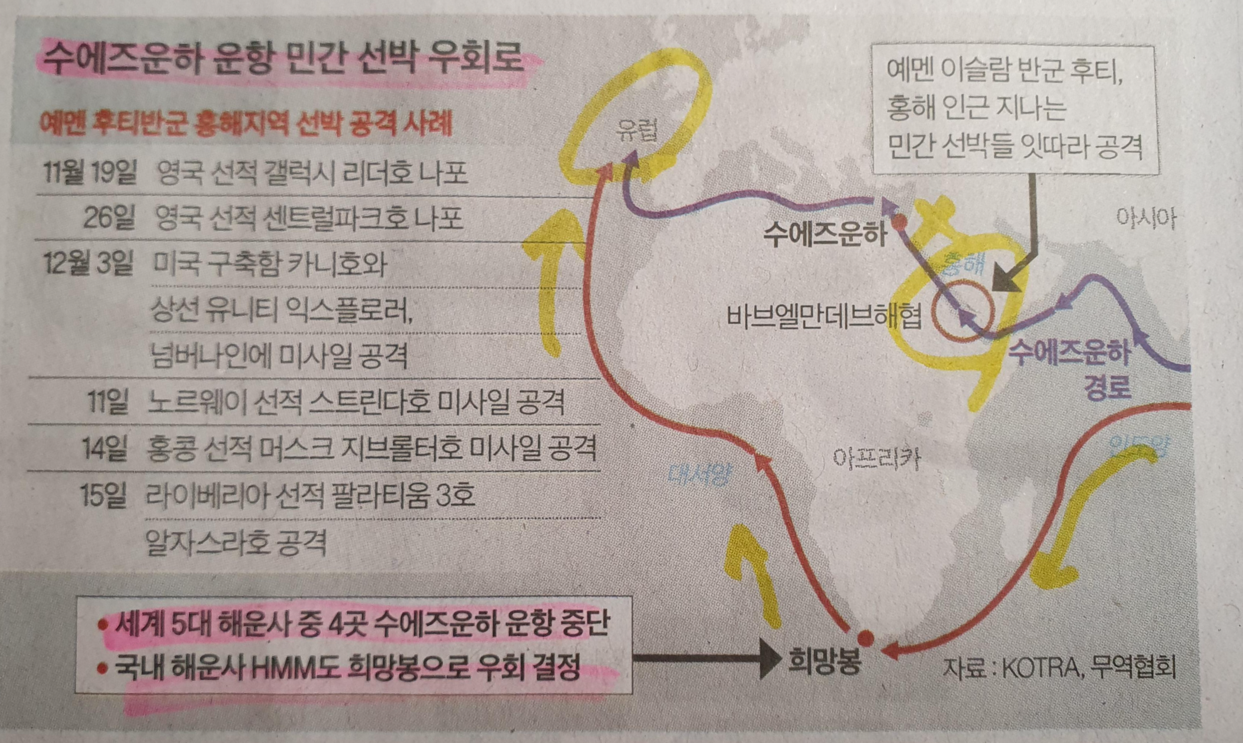 -세계 5대 해운사 중 4곳 수에즈운하 운항 중단, 국내 해운사인 HMM도 희망봉 우회 결정