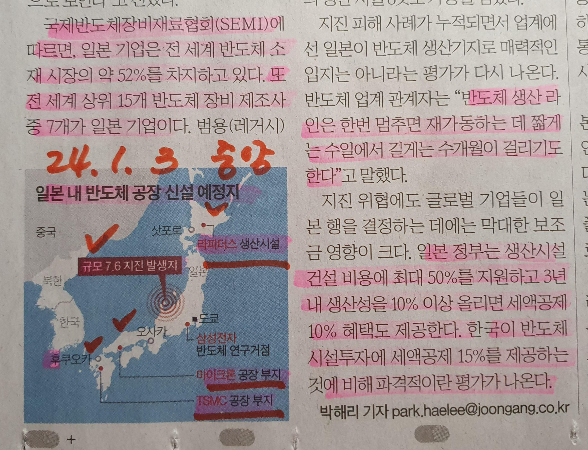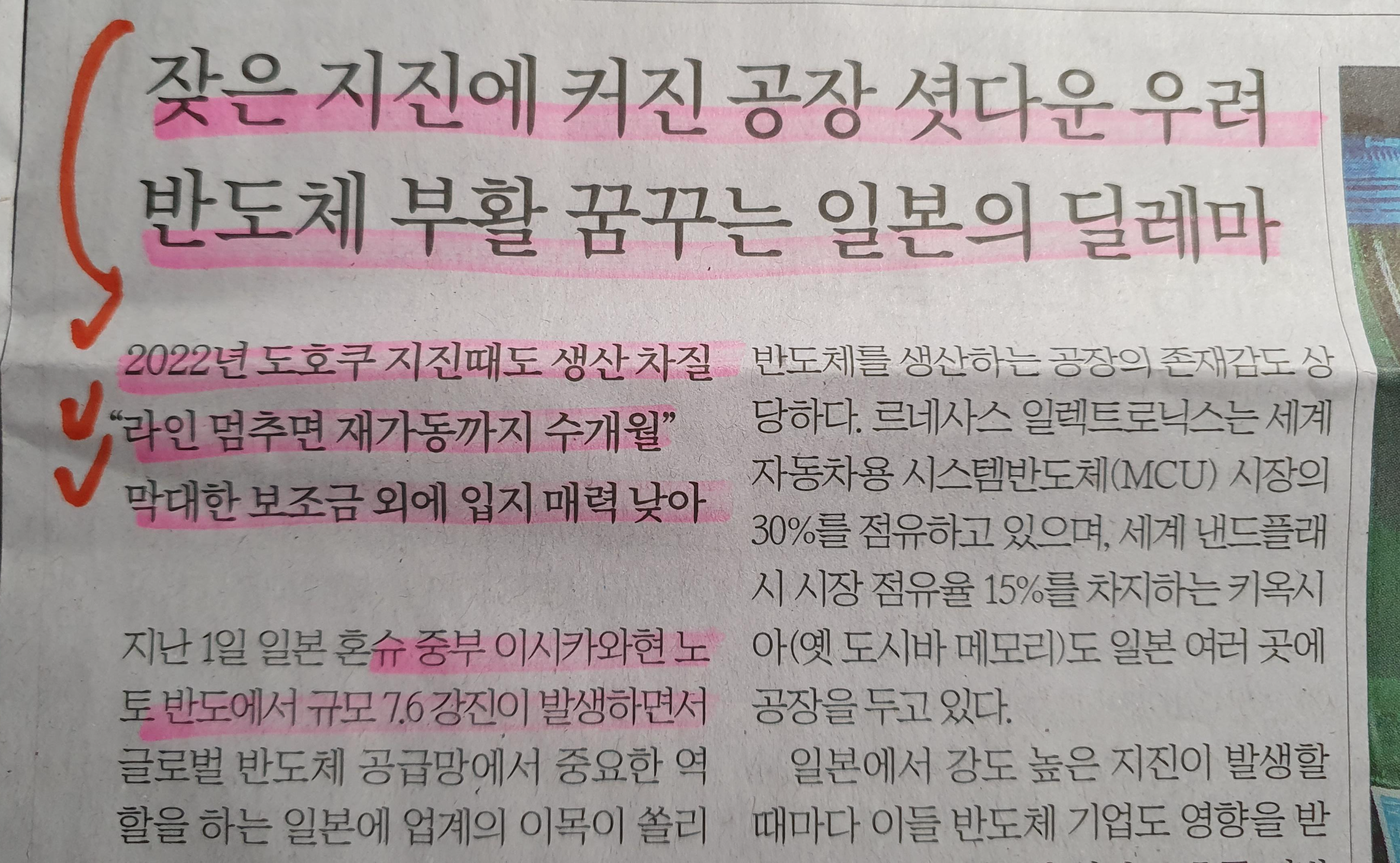 생각) 일본의 반도체 투자는 지속될 것이나, 지진이라는 자연재해에 대한 리스크를 안고 기업은 투자를 할 수 밖에 없을 듯 하다. 일본의 반도체 강국 위상을 다시 찾게 될지 궁금해 진다.
