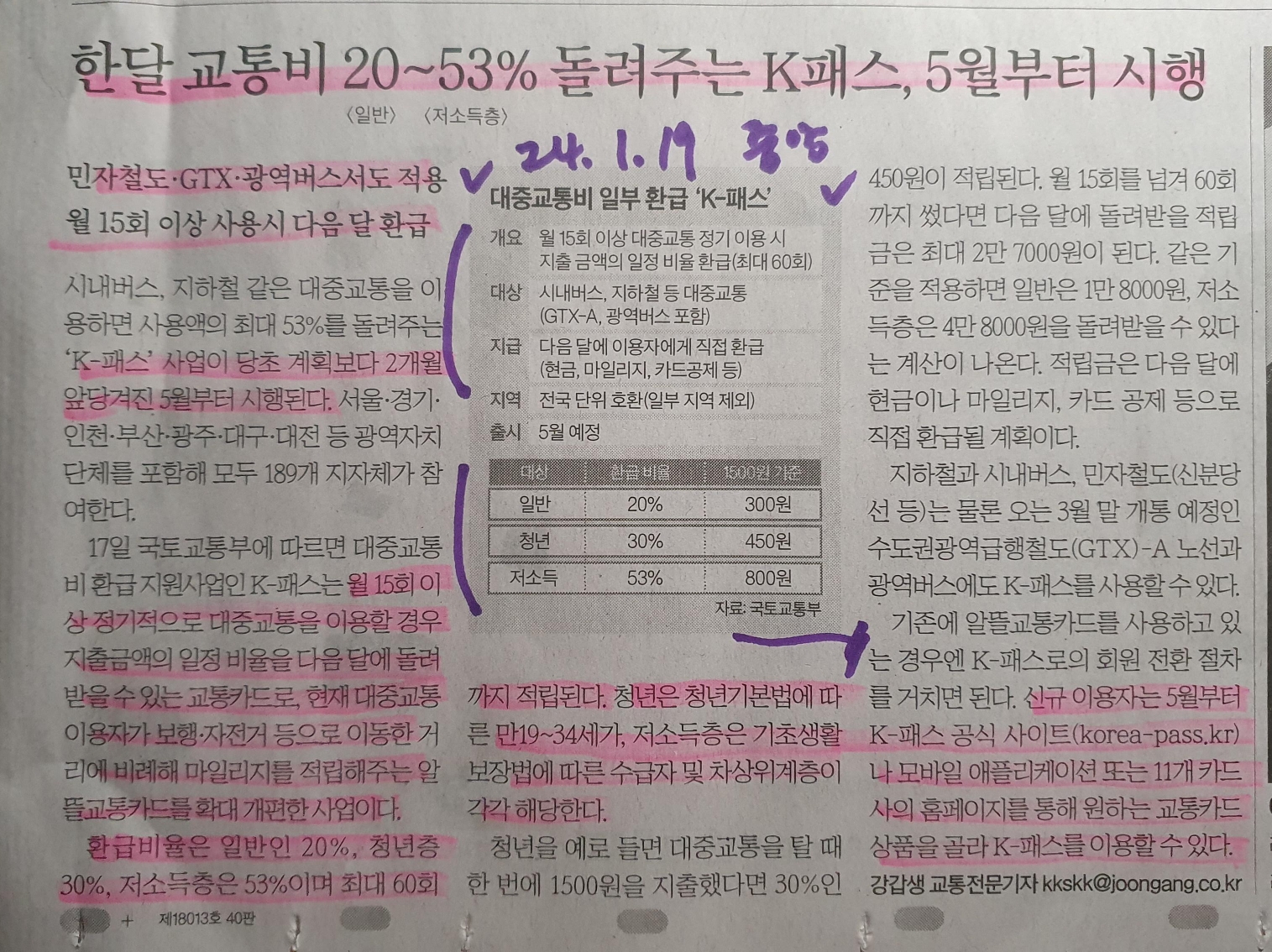 5월부터 K패스, 알뜰교통카드 업그레이드? 24.1.19 중앙