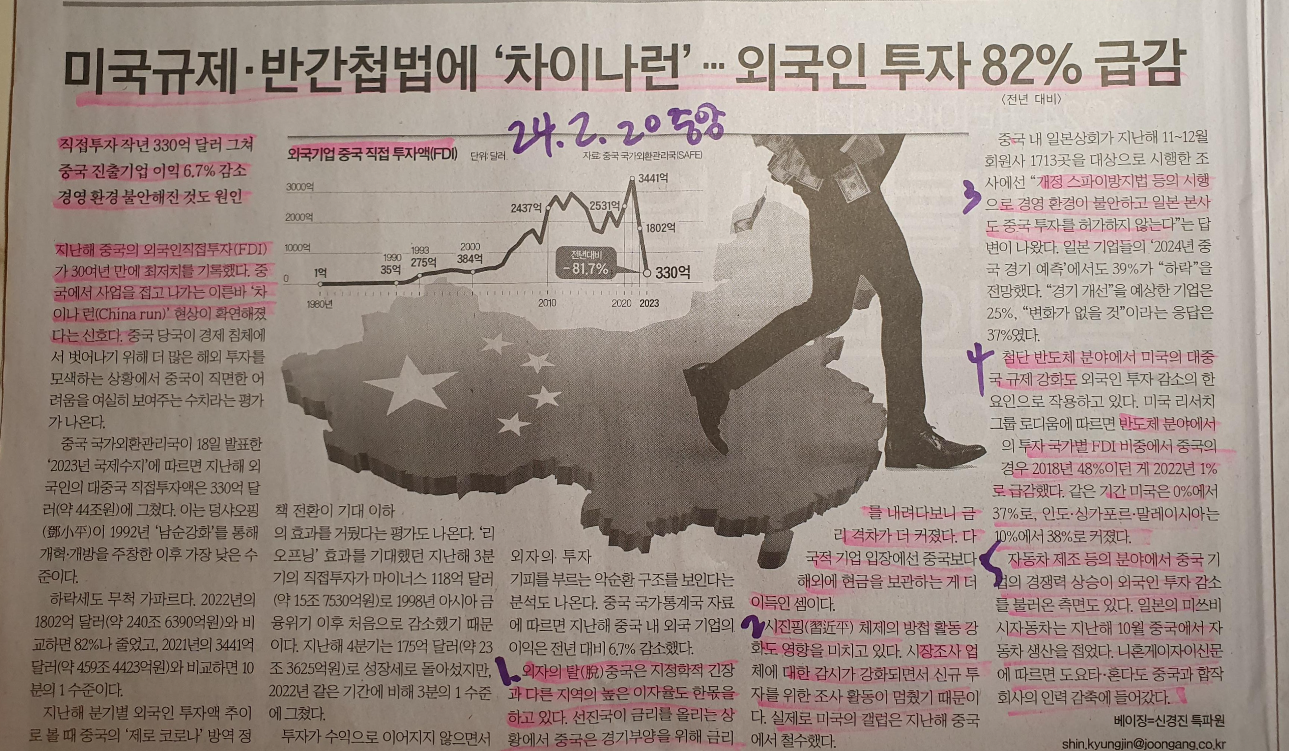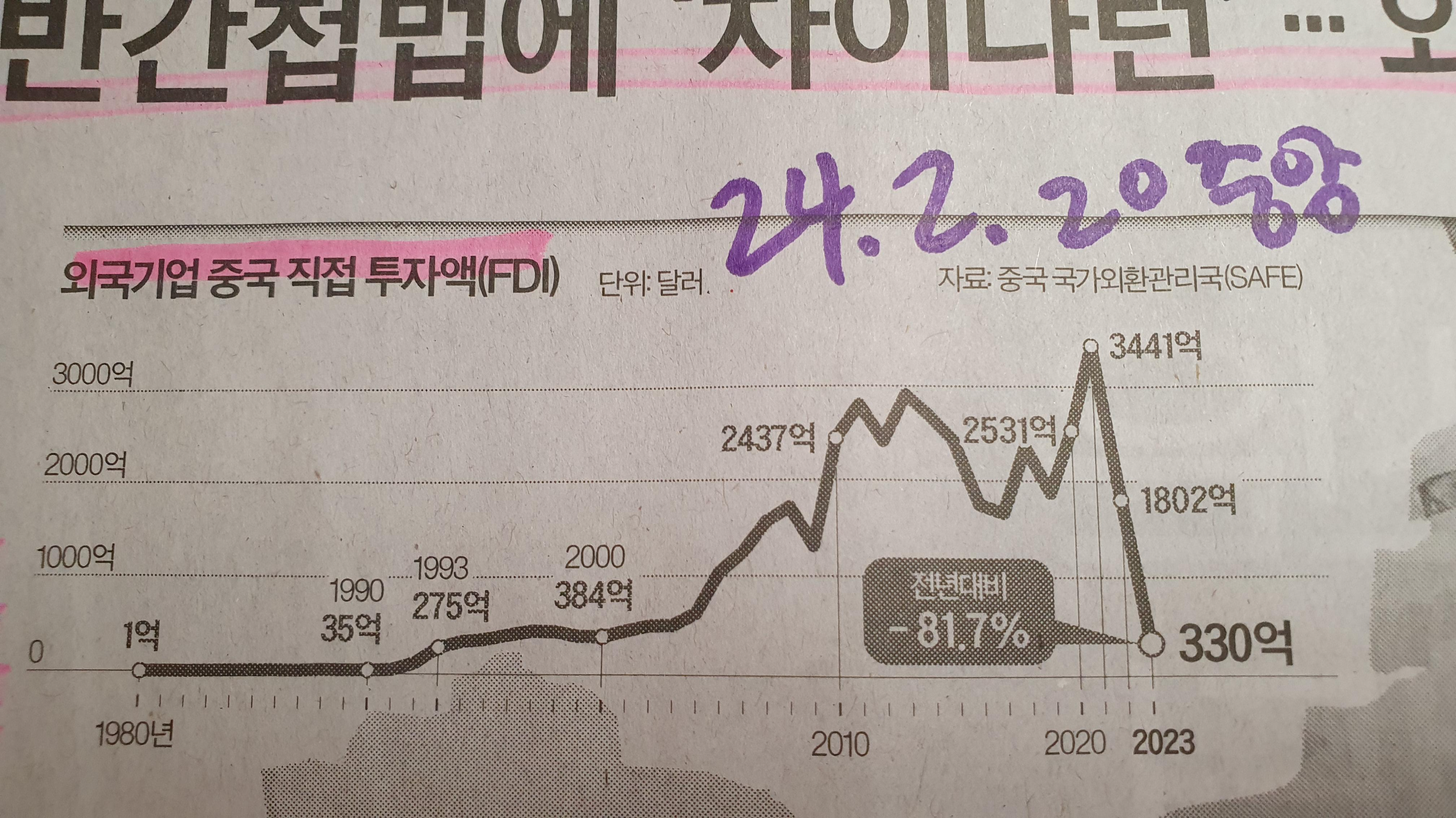 -미국의 중국 투자에 대한 견제도 있지만 2020년 3441억 달러에서 2023년 330억 달라라는 1/10 수준으로 외국기업의 중국 직접 투자액이 감소했다는 것은 큰 의미가 있다고 생각된다. (전년대비 -81.7%)