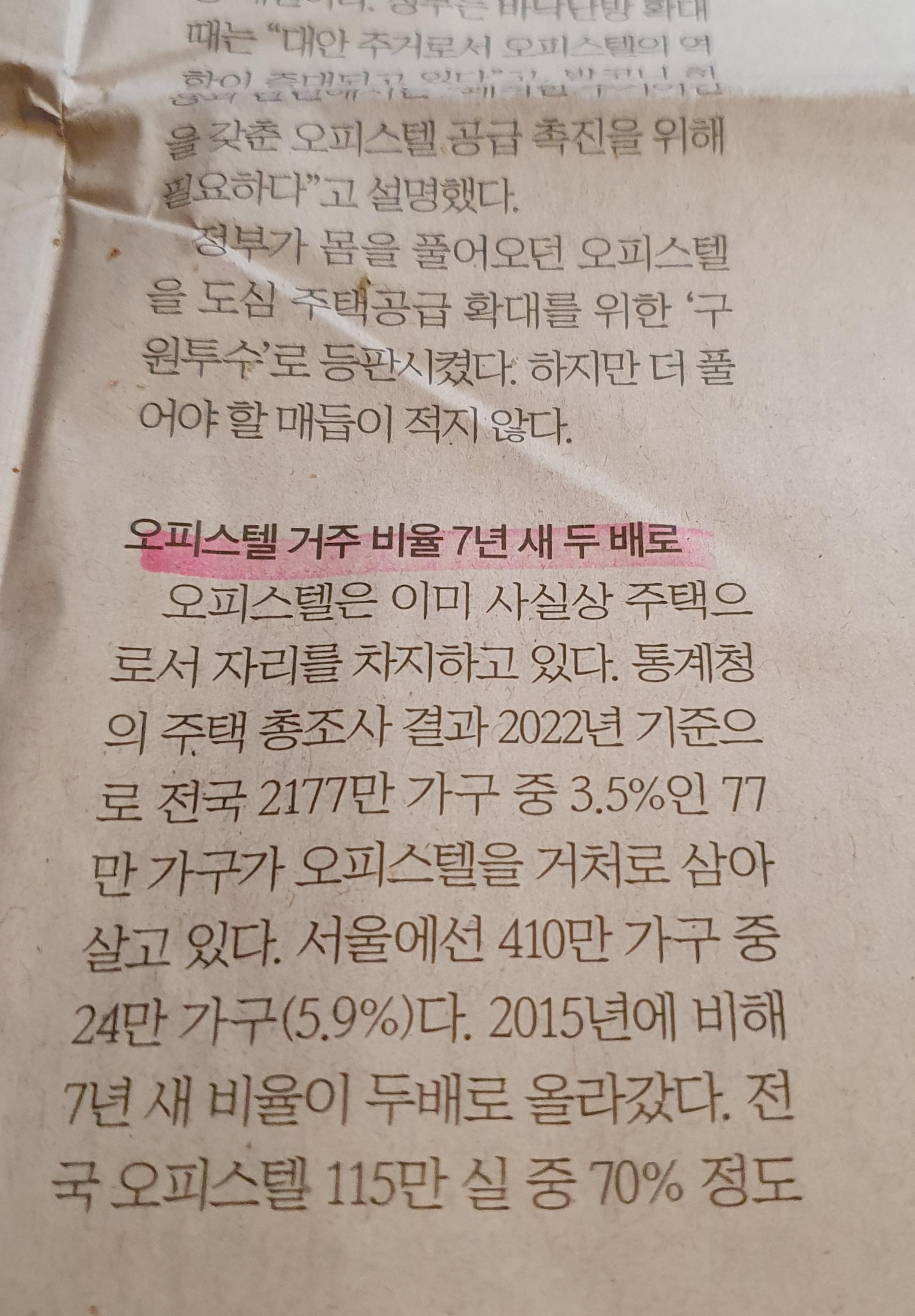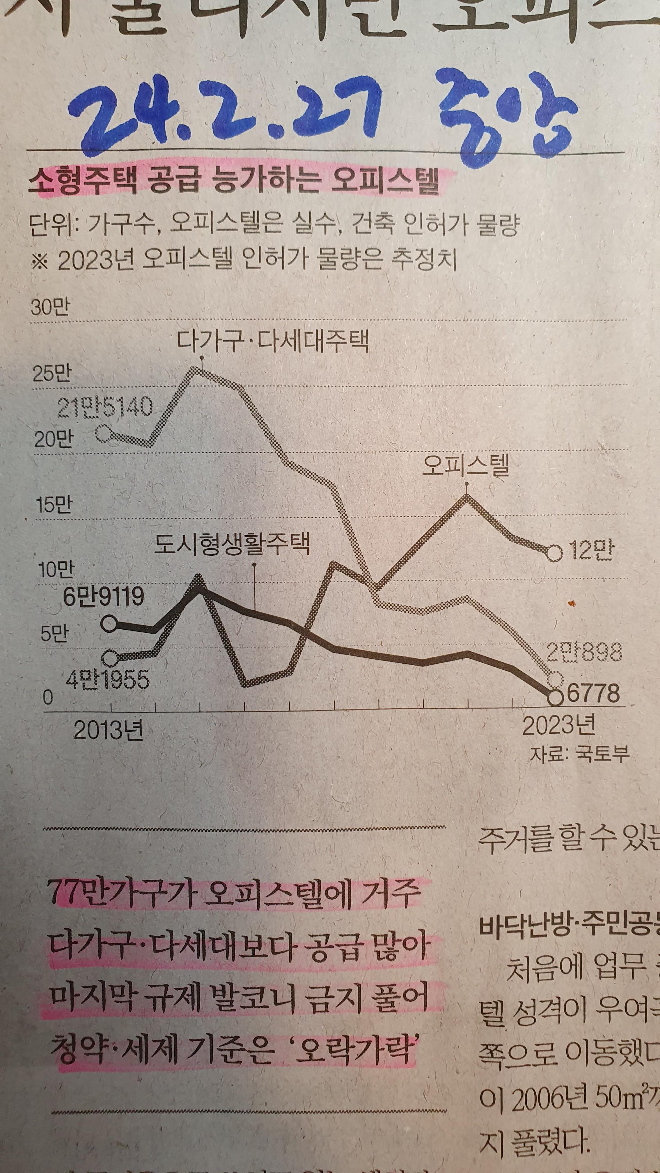-이미 77만 가구가 오피스텔에 거주하며, 이것은 다가구 다세대 주택보다도 공급이 많다.