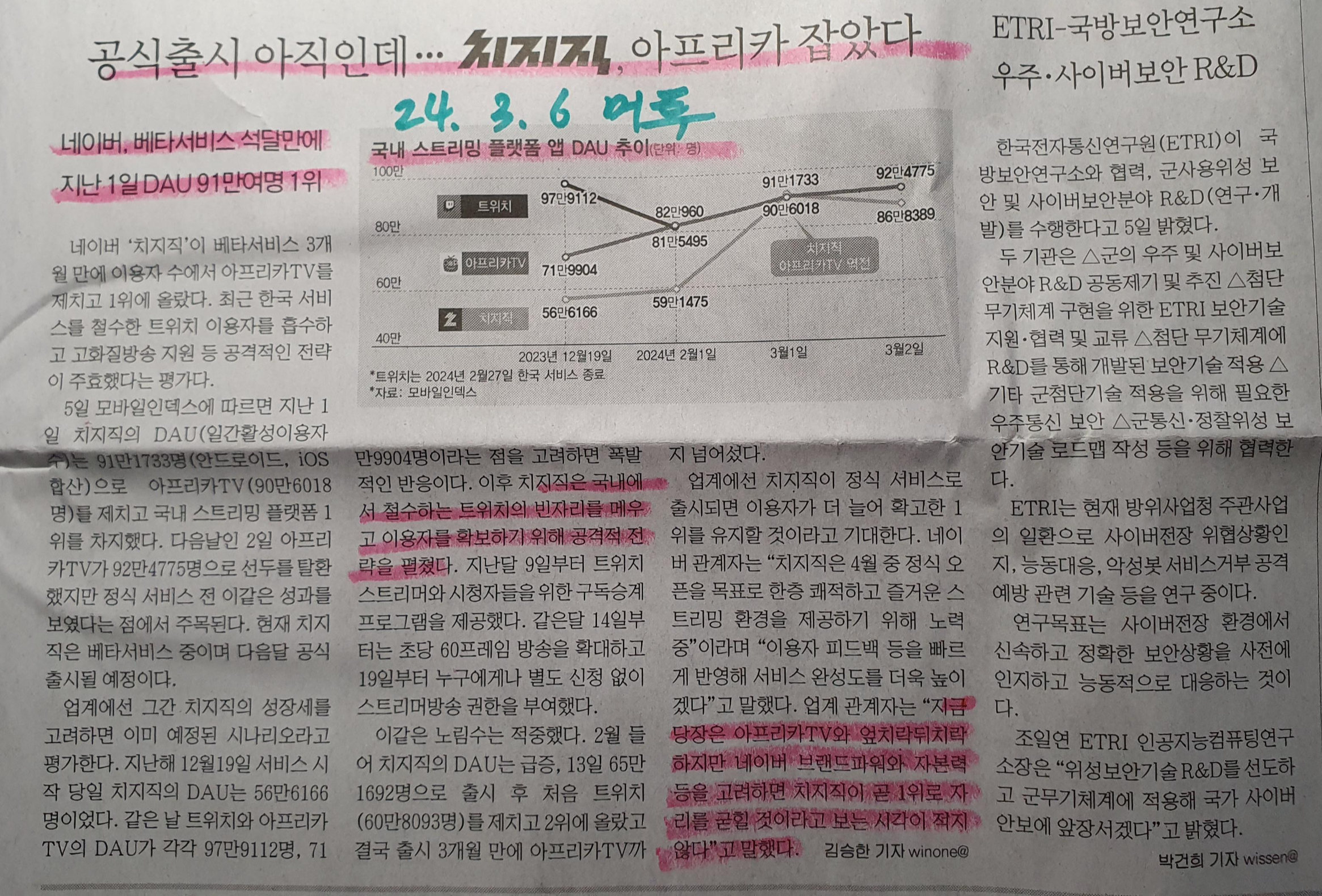 -네이버에서 베타서비스 중인 치지직은 서비스 석 달만에 DAU 수치는 91만 명으로 1위를 차지 트위치의 스트리머들이 넘어오면서 활성화가 되어가고 있다.
