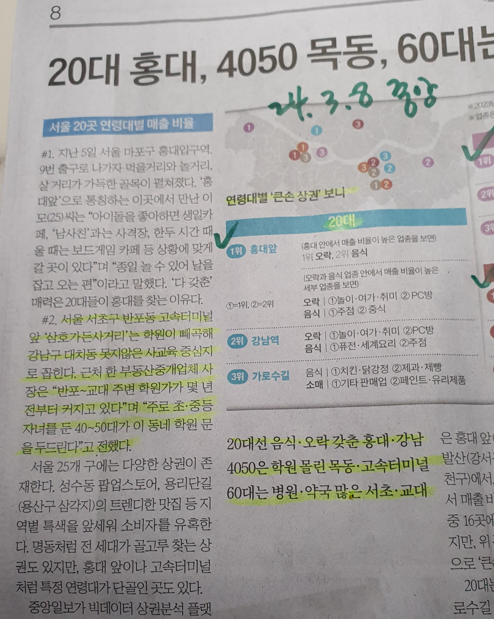 -20대는 젊의 트렌드한 홍대 강남 가로수길, 30대 마곡,발산, 잠실역, 여의도