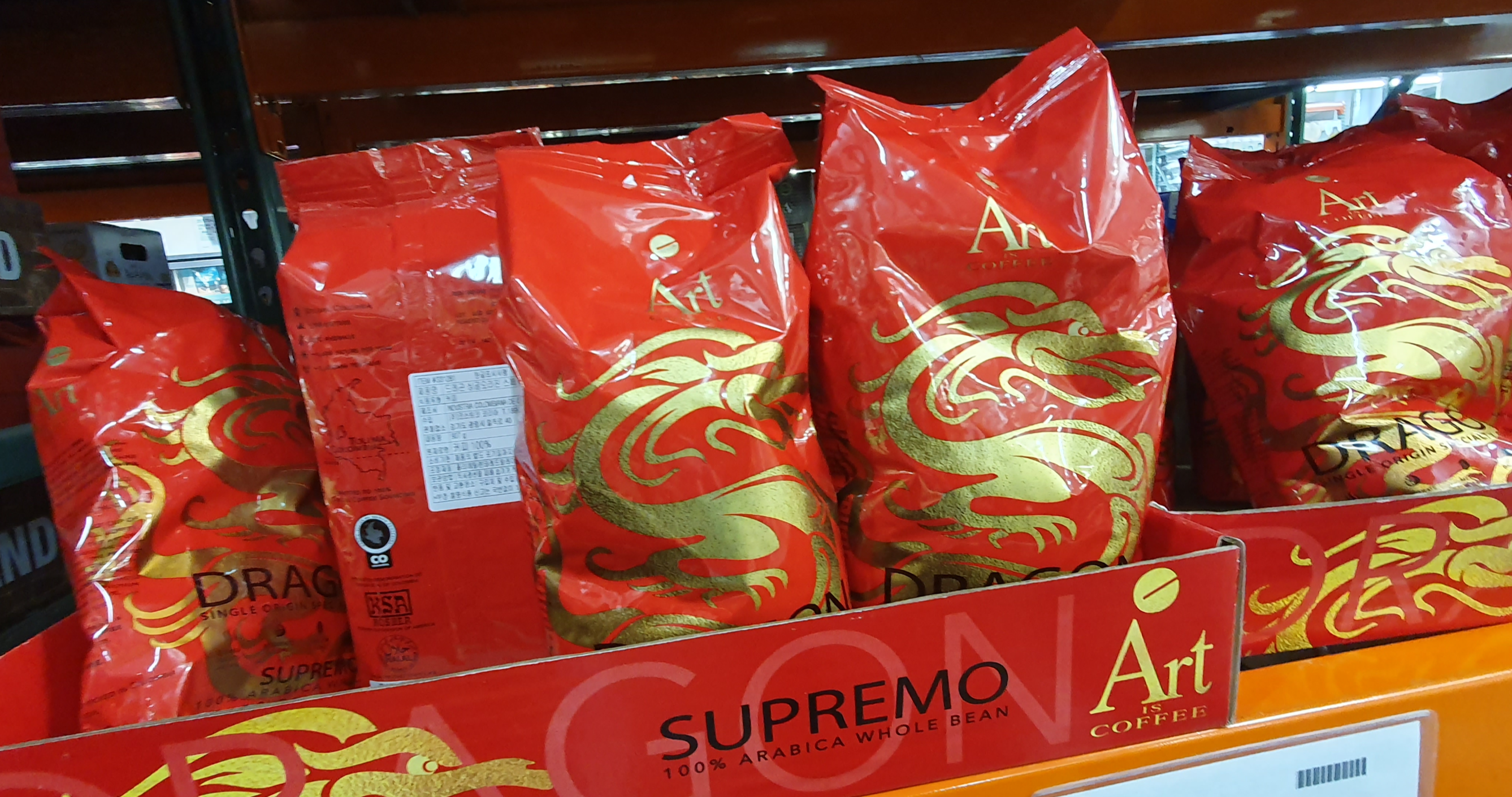 '아트 이즈 커피' 골든드래건 한정판 커피원두는 코스트코 저가 브랜드 '아트 이즈 커피'가 카우카, 베라, 브렉퍼스트 커피 등 일반 제품에 이어 크리스마스부터 설날까지 출시하는 신년 특별 패키지다.